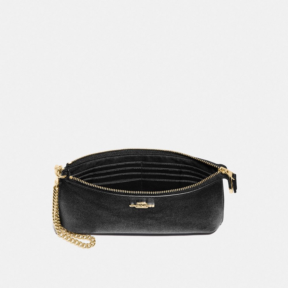 Crossgrain leather| Eight credit card slots| Zip-top closure, fabric lining| Wrist strap with dogleash clip attached| Outside open pocket| 8" (L) x 4 3/4" (H) x 3/4" (W)