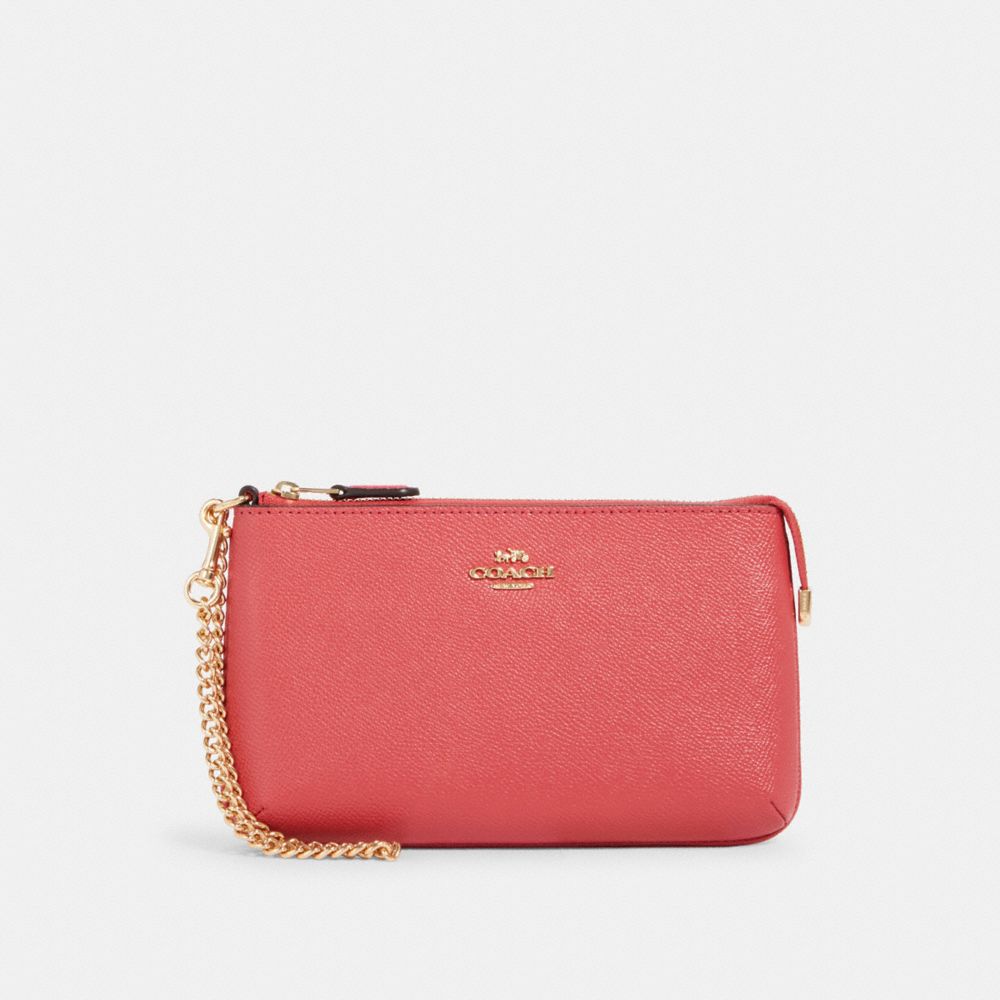 Crossgrain leather| Eight credit card slots| Zip-top closure, fabric lining| Wrist strap with dogleash clip attached| Outside open pocket| 8" (L) x 4 3/4" (H) x 3/4" (W)