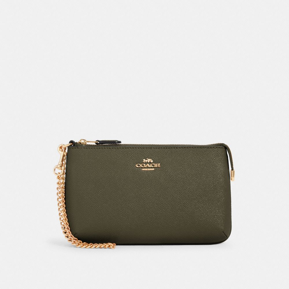 Crossgrain leather| Eight credit card slots| Zip-top closure, fabric lining| Wrist strap with dogleash clip attached| Outside open pocket| 8" (L) x 4 3/4" (H) x 3/4" (W)
