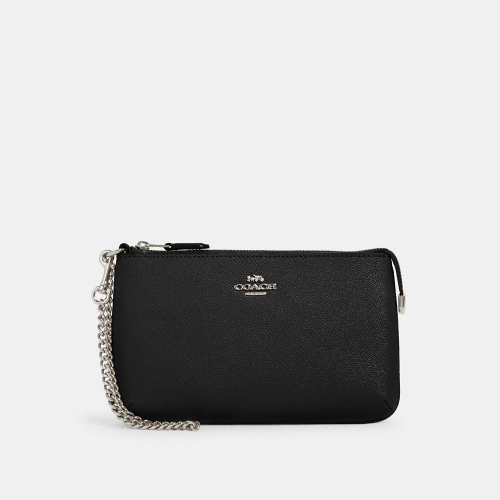 Crossgrain leather| Eight credit card slots| Zip-top closure, fabric lining| Wrist strap with dogleash clip attached| Outside open pocket| 8" (L) x 4 3/4" (H) x 3/4" (W)