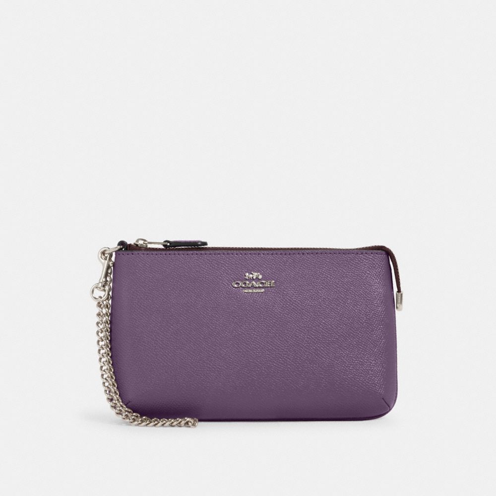 Crossgrain leather| Eight credit card slots| Zip-top closure, fabric lining| Wrist strap with dogleash clip attached| Outside open pocket| 8" (L) x 4 3/4" (H) x 3/4" (W)