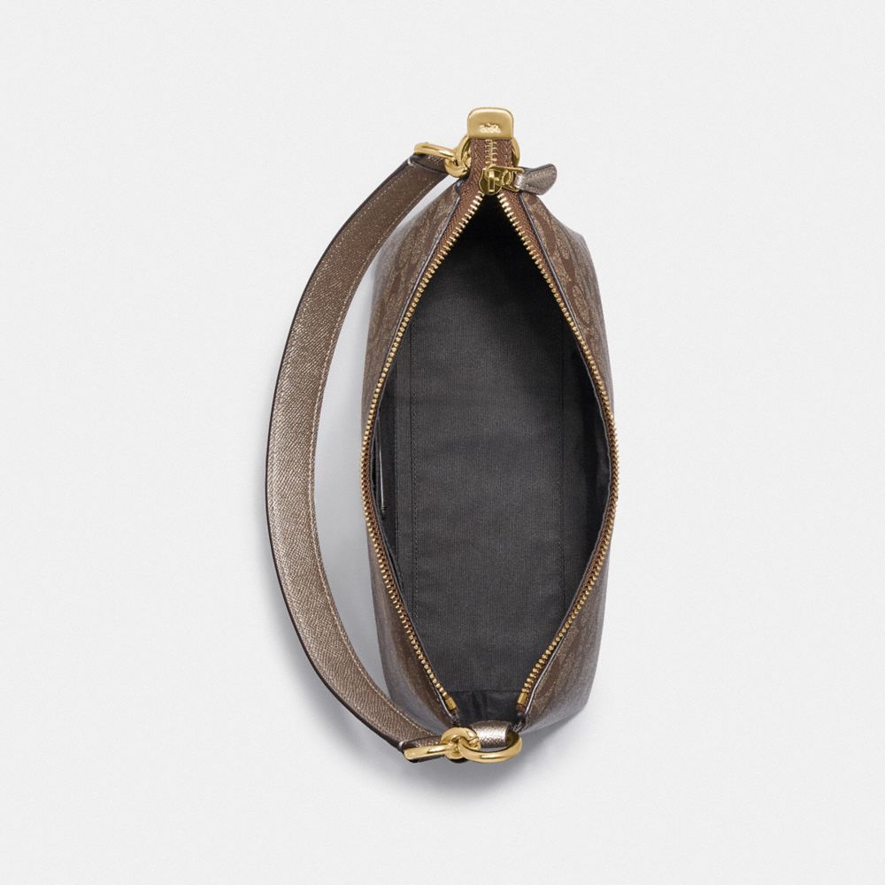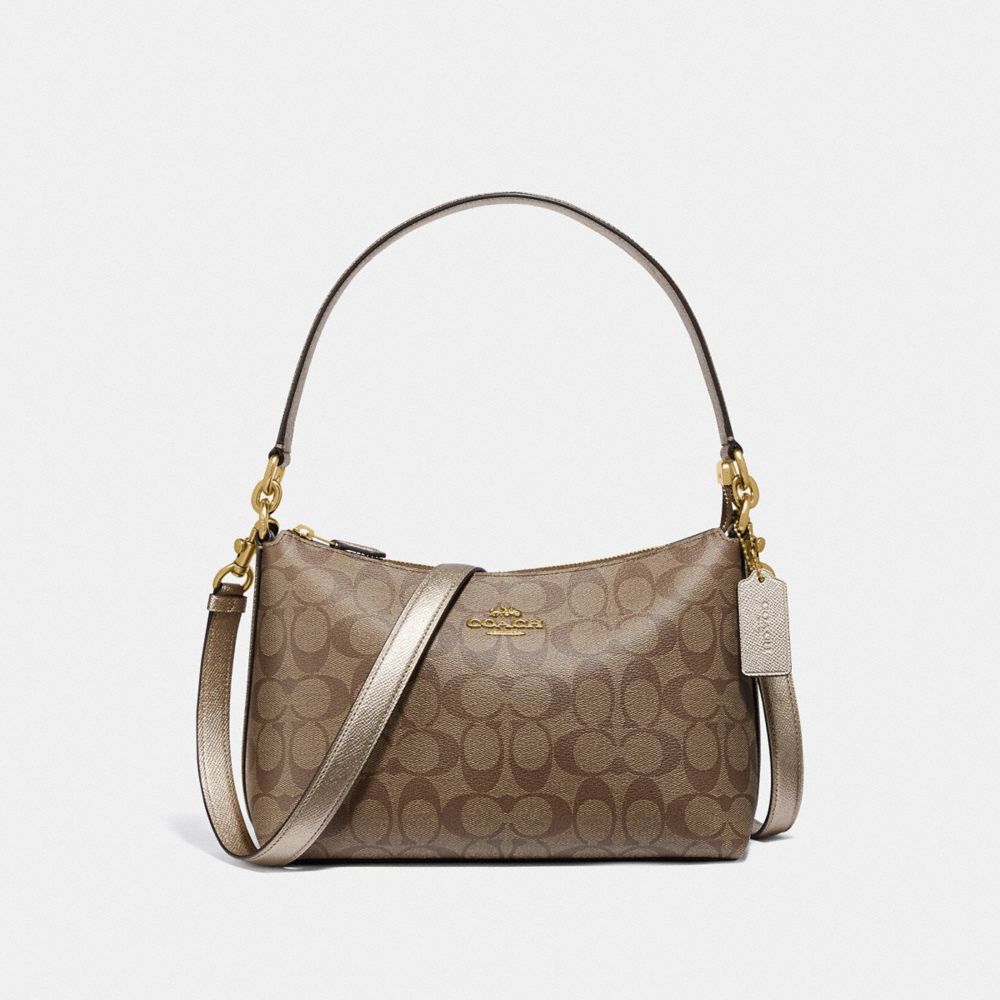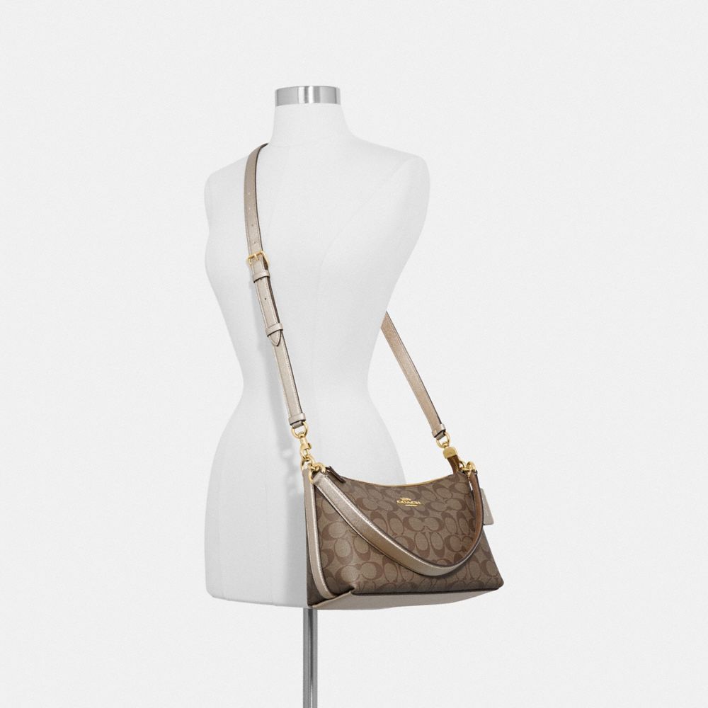 Signature coated canvas with metallic crossgrain leather details| Inside multifunction pocket| Zip-top closure, fabric lining| Handle with 7 3/4" drop| Detachable strap with 21 1/4" drop for shoulder or crossbody wear| 10 1/4" (L) x 7" (H) x 4 1/4" (W)