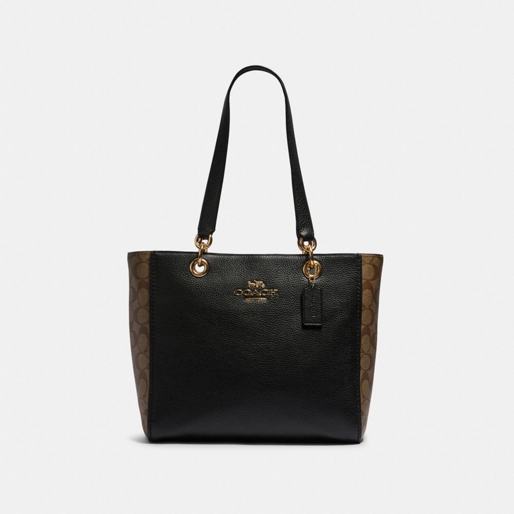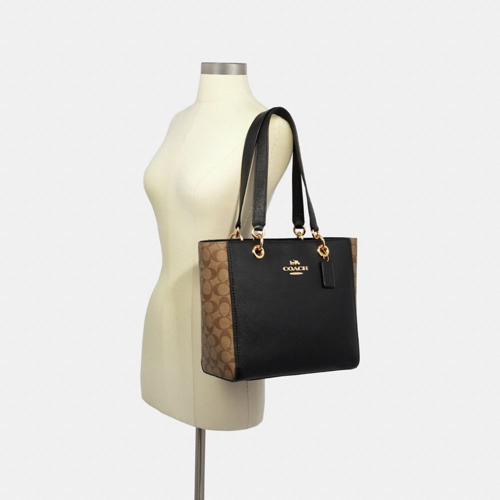 Signature coated canvas and refined pebble leather| Inside zip, cell phone and multifunction pockets| Zip-top closure, fabric lining| Handles with 10" drop| 11 3/4" (L) x 10" (H) x 5 1/4" (W)