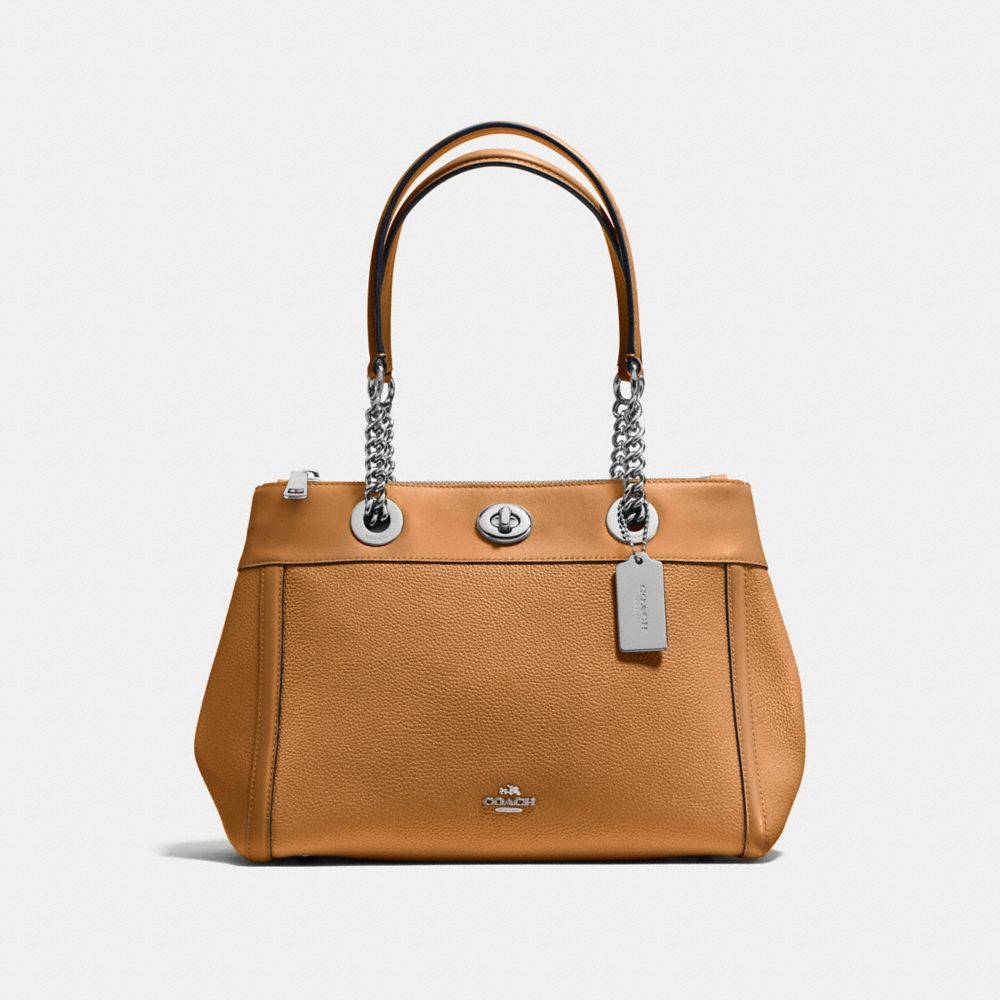 Polished pebble leather| Inside zip, cell phone and multifunction pockets| Zip compartment| Snap closure, fabric lining| Handles with 8 1/4" drop | Outside turnlock pocket| 11 1/2" (L) x 8 3/4" (H) x 7" (W)