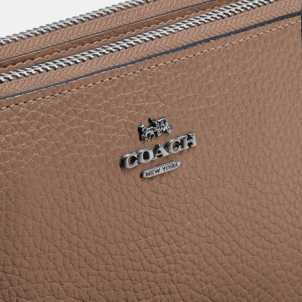 Polished pebble leather| Four credit card slots| Double zip closure, fabric lining| Center open compartment| Detachable wrist strap| Detachable long strap with 23" drop for shoulder or crossbody wear| 7 1/2" (L) x 4" (H) x 1 3/4" (W)