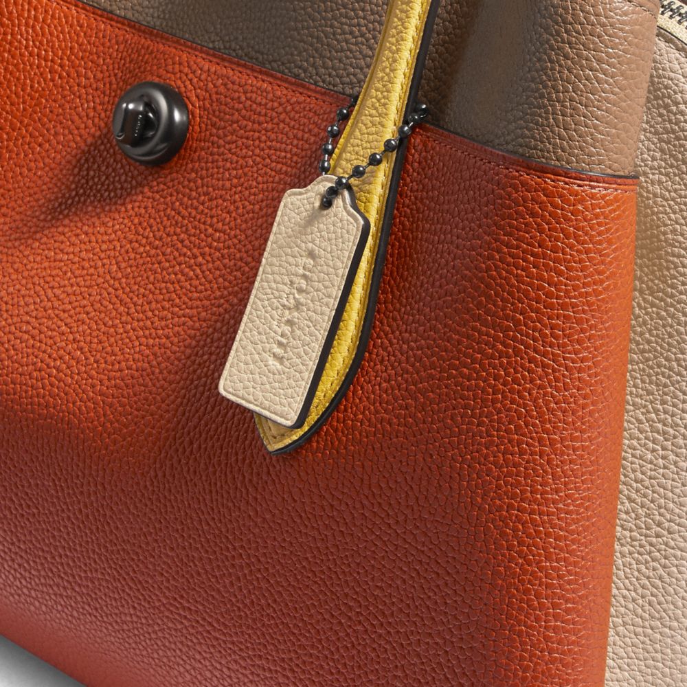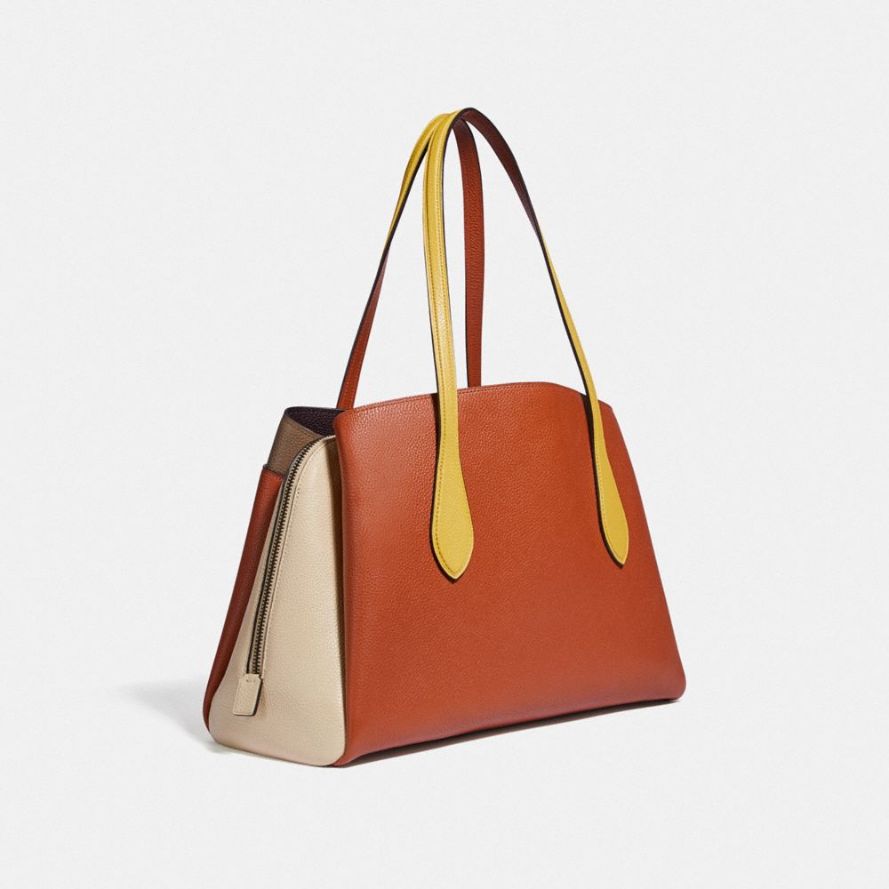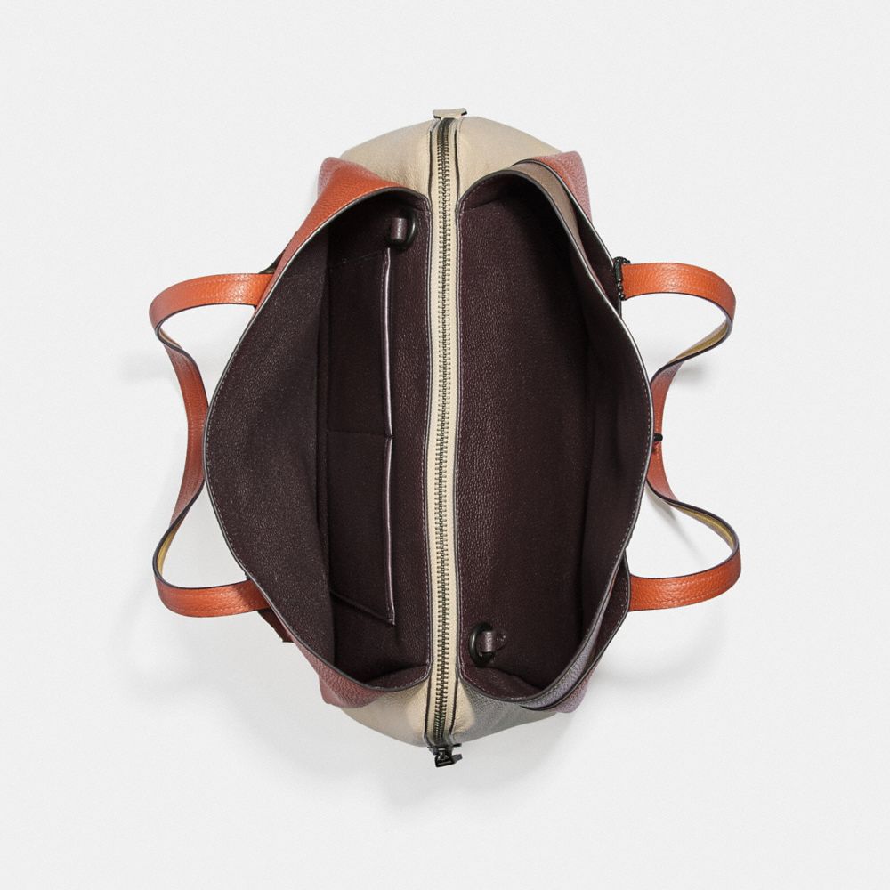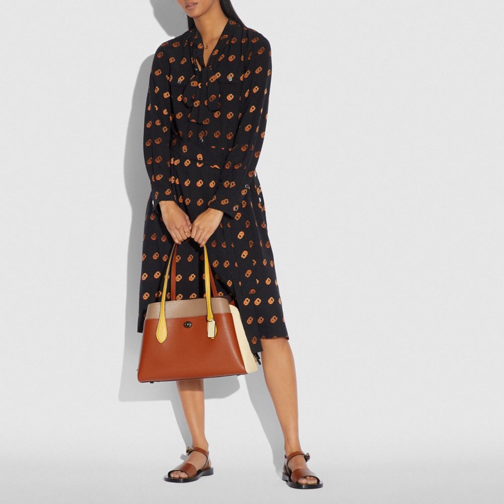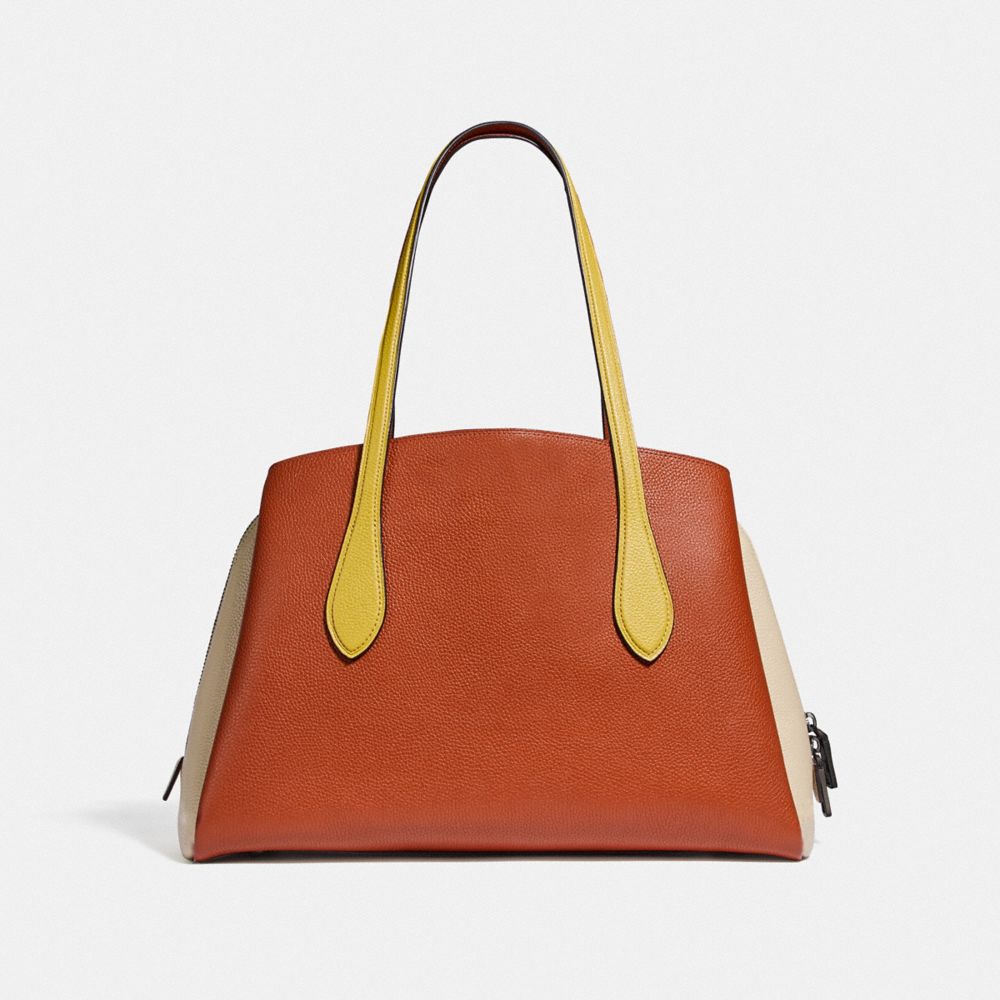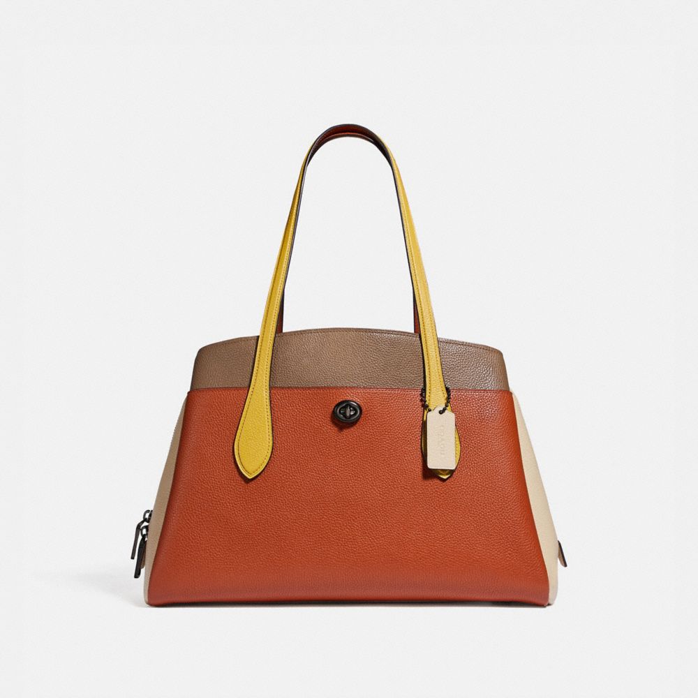 Polished pebble leather| Inside snap, cell phone and multifunction pockets| Zip closure, fabric lining| Side open compartments| Handles with 8 1/2" drop| Outside turnlock pocket| Fits a 13" laptop| 14 1/4" (L) x 10 1/4" (H) x 6 1/4" (W)
