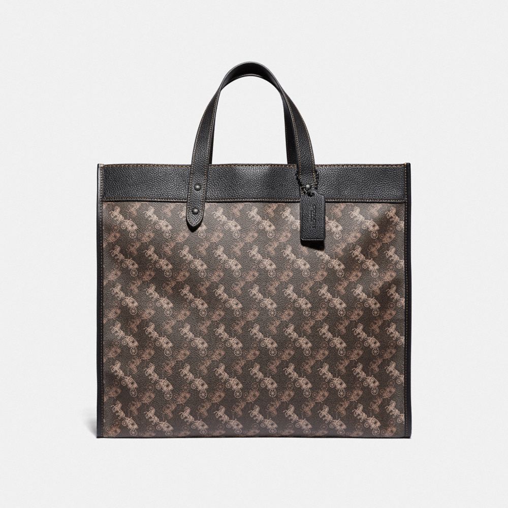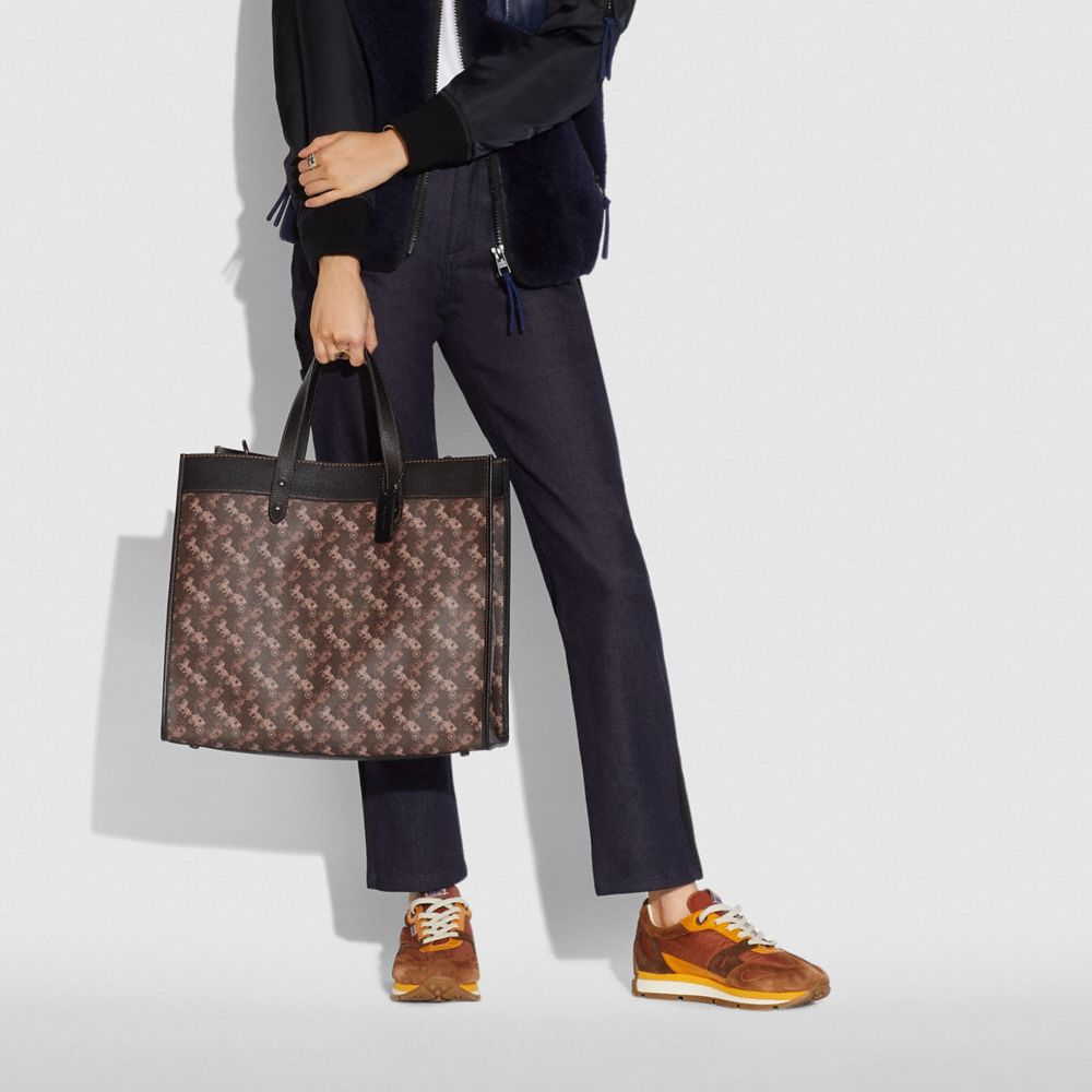 Printed coated canvas and polished pebble leather| Inside zip pocket| Snap closure, fabric lining| Handles with 6" drop| Detachable strap with 23 1/2" drop for shoulder or crossbody wear| Fits a 15" laptop| 15 3/4" (L) x 14" (H) x 8" (W)Style No. 89144