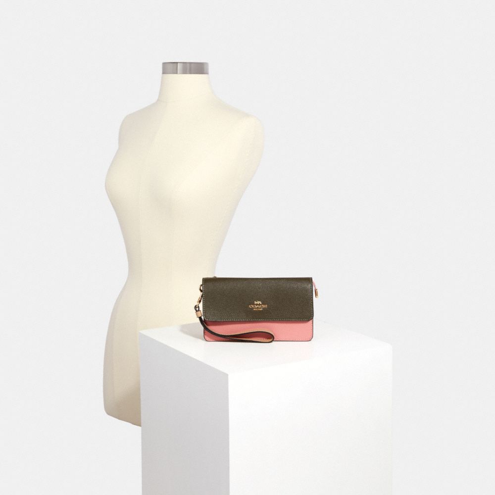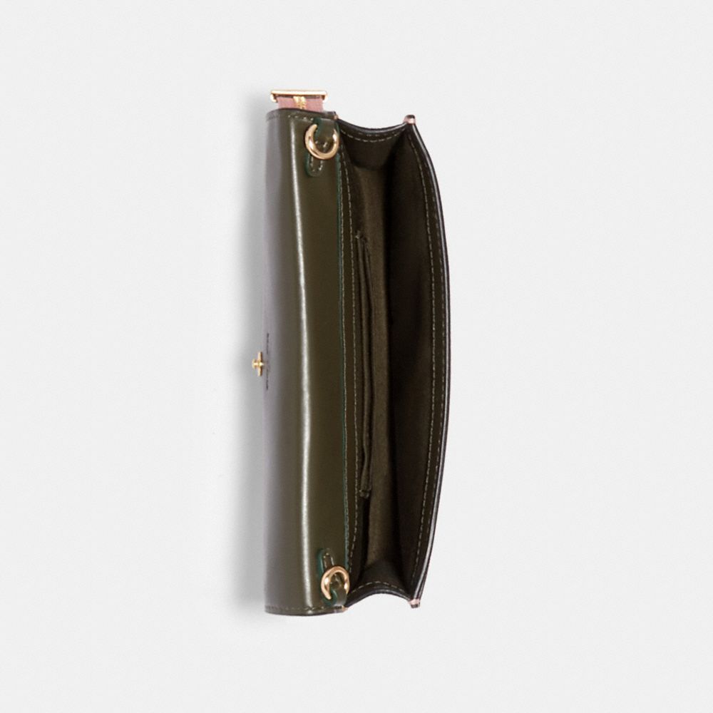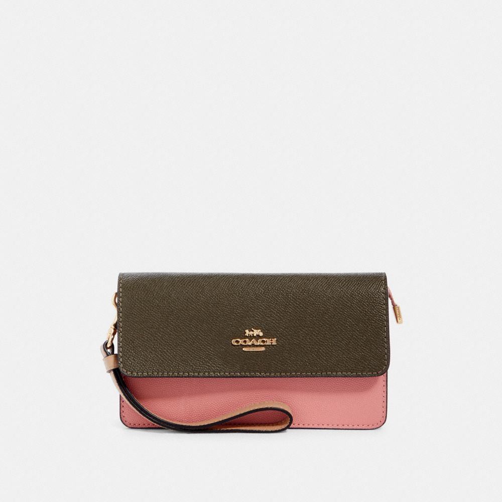 Grain leather| One credit card slot| Snap closure, fabric lining| Outside zip pocket| Detachable wrist strap| 7" (L) x 4" (H) x 1 3/4" (W)