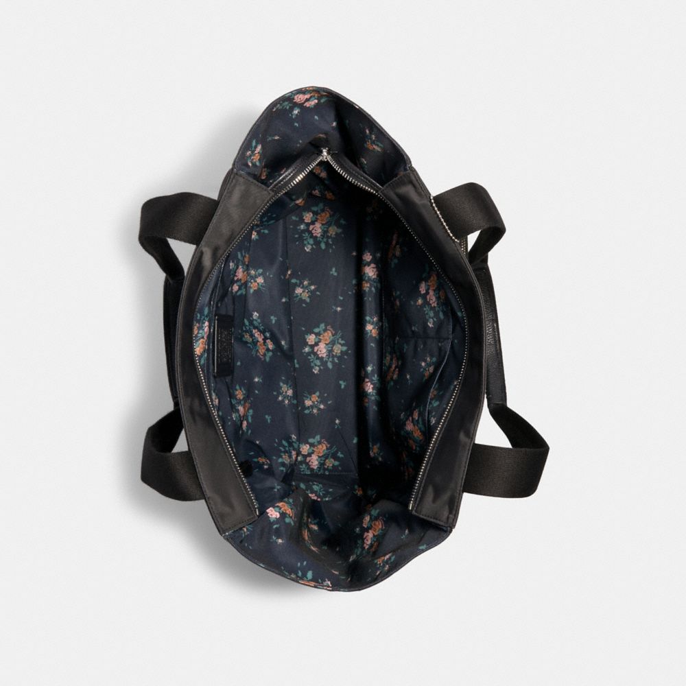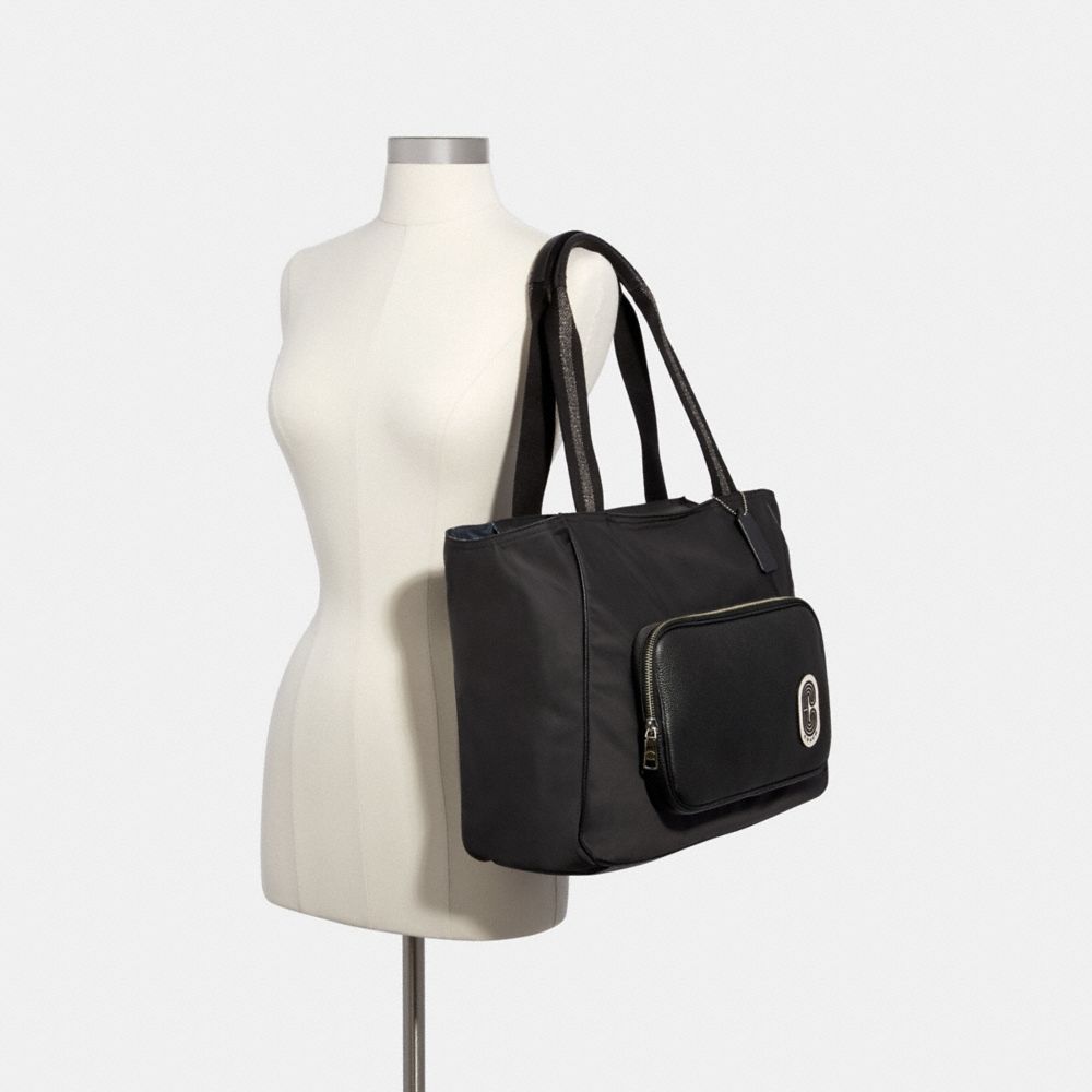 Nylon and refined pebble leather| Inside zip pocket| Zip-top closure, fabric lining| Handles with 10" drop| Outside zip pocket| 15 1/2" (L) x 12 1/2" (H) x 5 3/4" (W)
