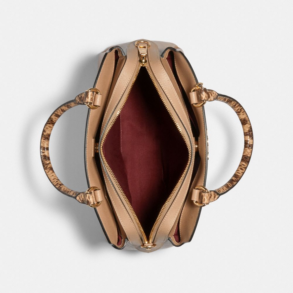 Crossgrain leather, smooth leather and snake-embossed leather| Inside zip and multifunction pockets| Center zip compartment| Snap closure, fabric lining| Handles with 4 3/4" drop| Outside open pocket| Detachable strap with 20" drop for shoulder or crossbody wear| 12 3/4" (L) x 8 3/4" (H) x 5 1/4" (W)