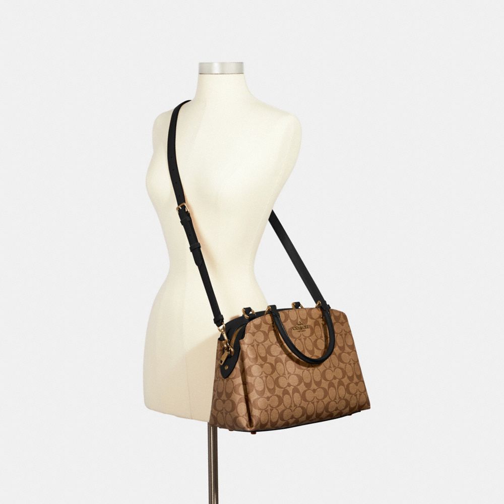 Signature coated canvas with smooth leather details| Inside zip and multifunction pockets| Center zip compartment| Snap closure, fabric lining| Handles with 4 3/4" drop| Outside open pocket| Detachable strap with 20" drop for shoulder or crossbody wear| 12 3/4" (L) x 8 3/4" (H) x 5 1/4" (W)