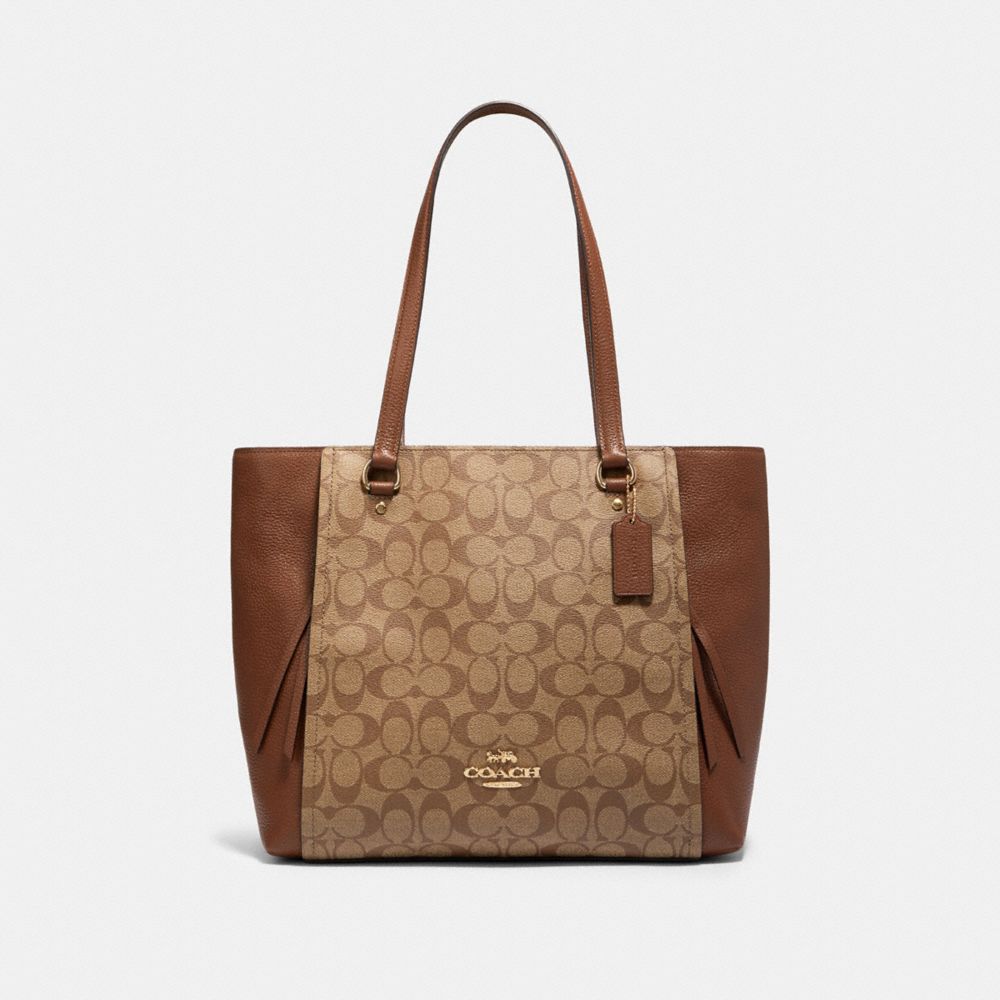 Signature coated canvas and refined pebble leather| Inside zip, cell phone and multifunction pockets| Zip-top closure, fabric lining| Handles with 10" drop| Outside zip pockets| 15 1/4" (L) x 11 1/4" (H) x 5 1/4" (W)
