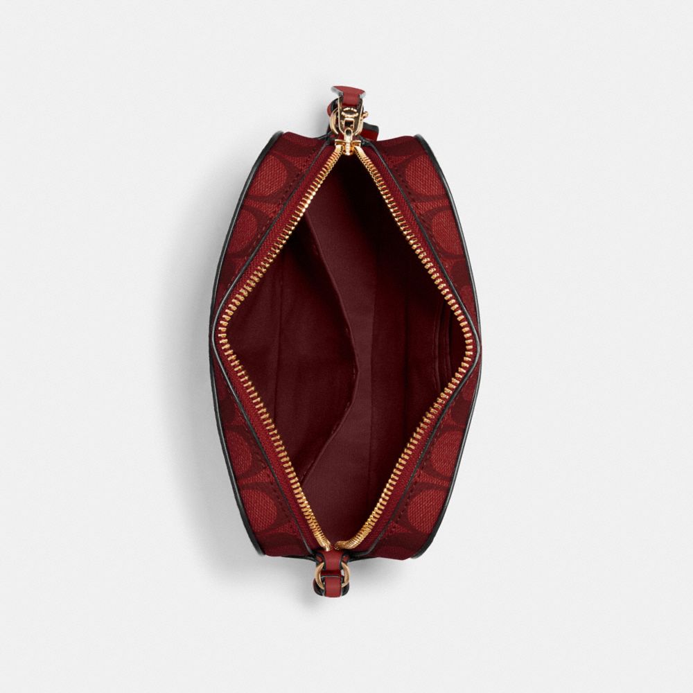 Signature coated canvas and smooth leather| Two credit card slots| Inside multifunction pocket| Zip closure, fabric lining| Outside open pocket| Adjustable strap with 23" drop for shoulder or crossbody wear| 7 1/4" (L) x 5 1/4" (H) x 2" (H)