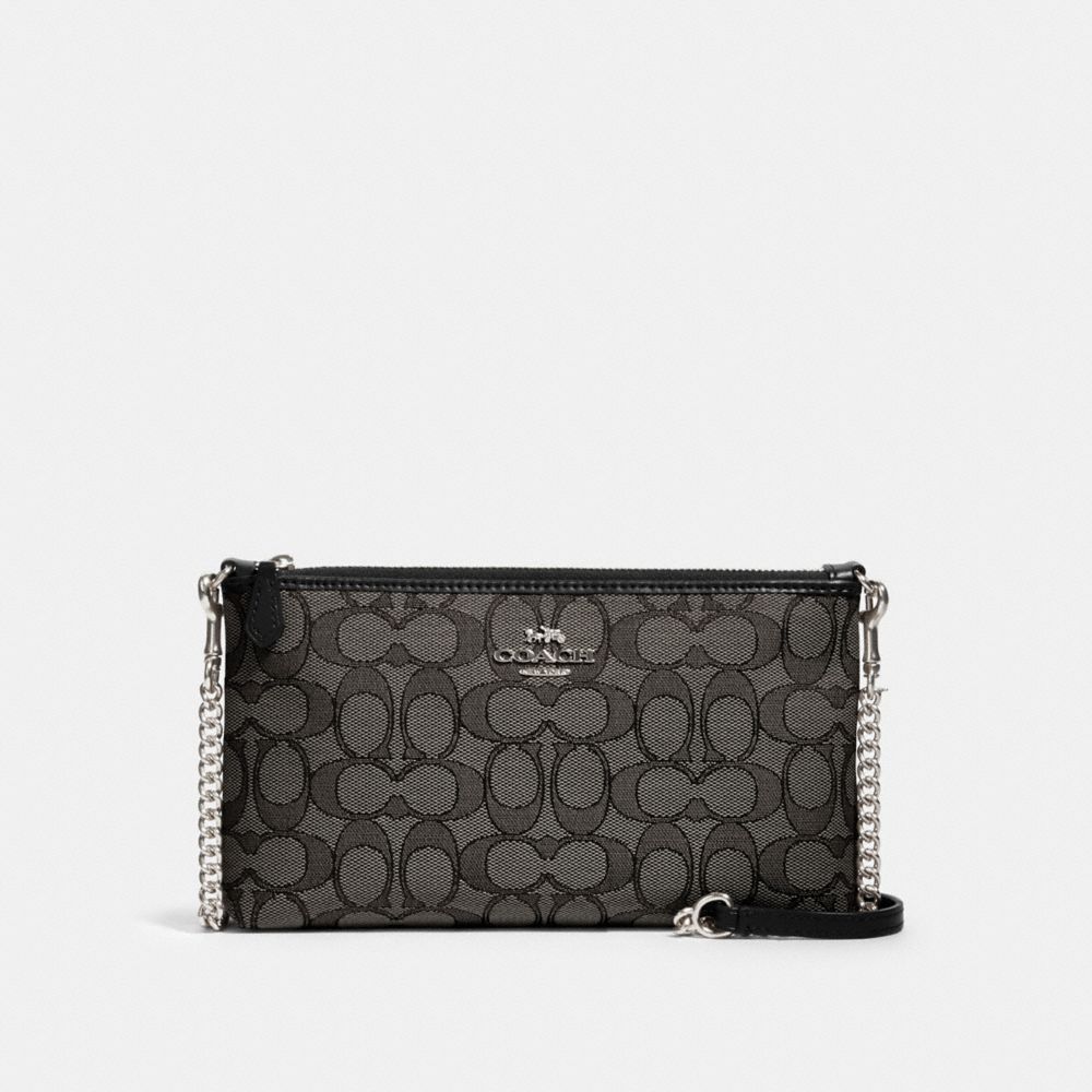 Signature coated canvas with smooth leather details| Two credit card slots| Zip-top closure, fabric lining| Detachable strap with 21 1/4" drop for shoulder or crossbody wear| 8 3/4" (L) x 5" (H)