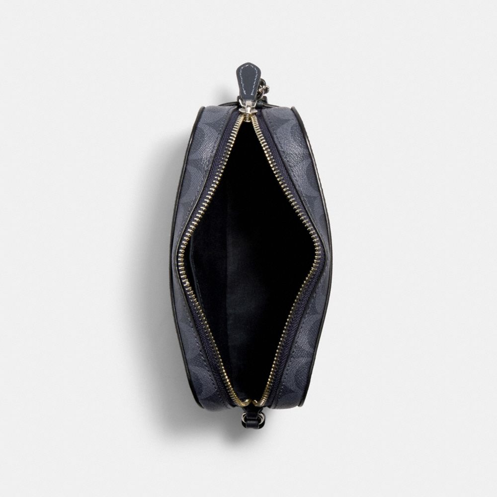 Signature coated canvas and smooth leather| Two credit card slots| Inside multifunction pocket| Zip closure, fabric lining| Outside open pocket| Adjustable strap with 23" drop for shoulder or crossbody wear| 7 1/4" (L) x 5 1/4" (H) x 2" (H)