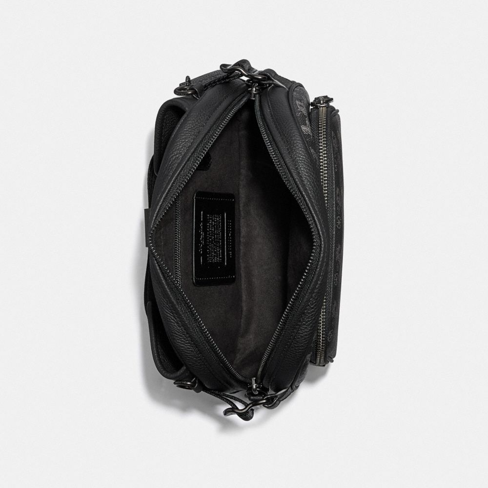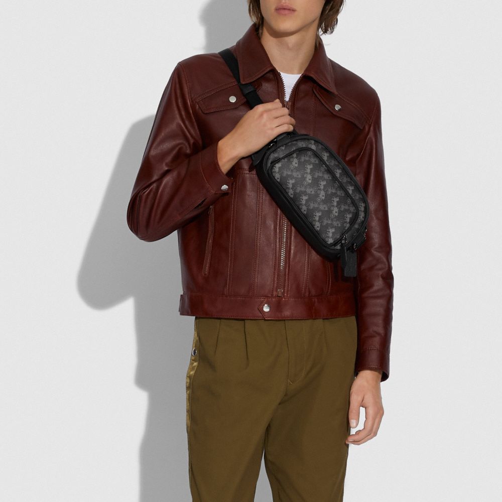 Printed coated canvas and soft polished pebble leather| Inside zip pocket| Zip closure, fabric lining| Outside zip pocket| Adjustable strap with speedclip for wear at waist| 10 1/2" (L) x 5 1/2" (H) x 3 1/4" (W)Style No. C0143