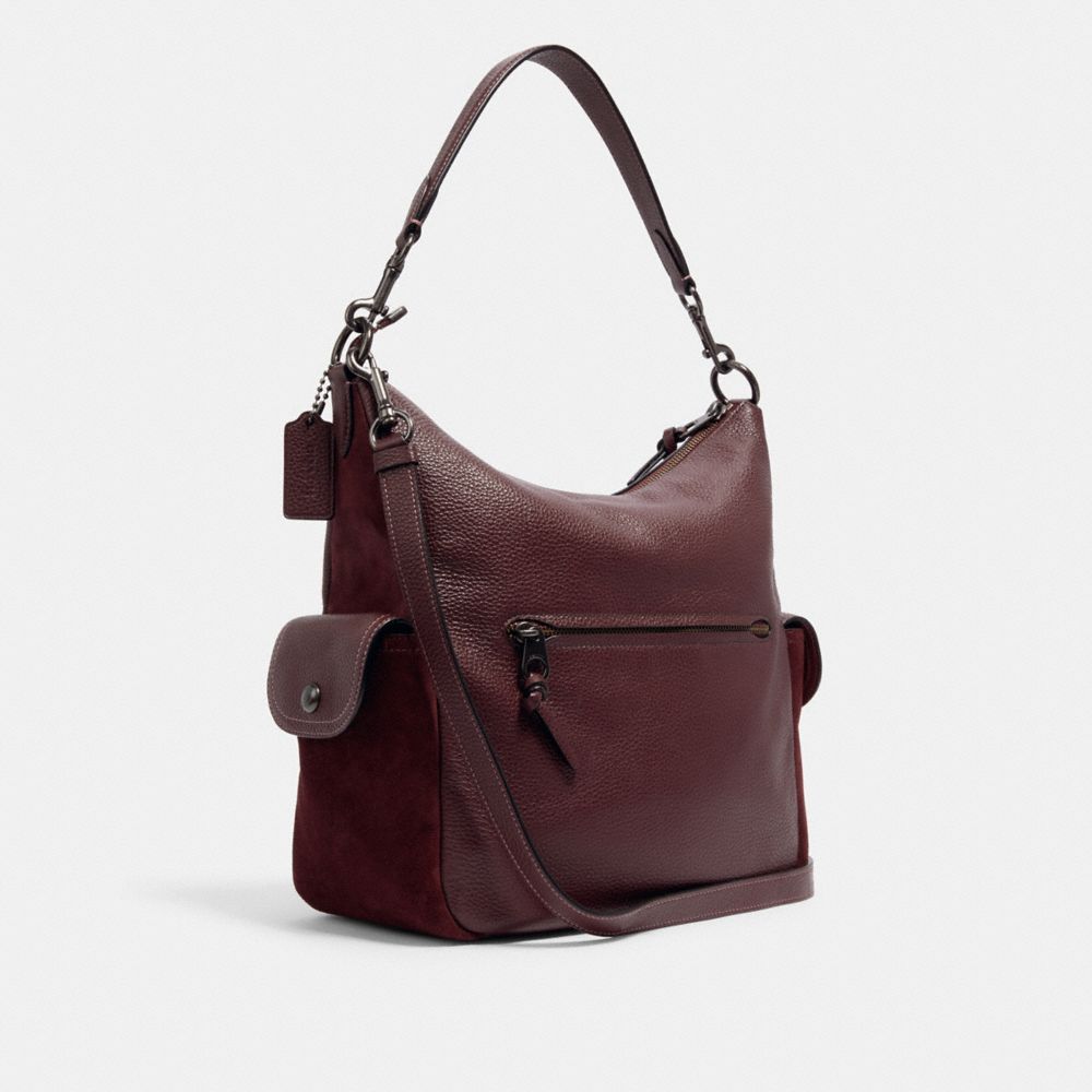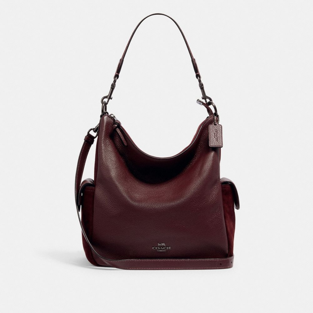Refined pebble leather and suede| Inside zip pocket| Zip-top closure, fabric lining| Detachable handle with 7" drop| Outside zip and snap pockets| Detachable strap with 20 3/4" drop for shoulder or crossbody wear| 10 3/4" (L) x 11 3/4" (H) x 5 1/4" (W)