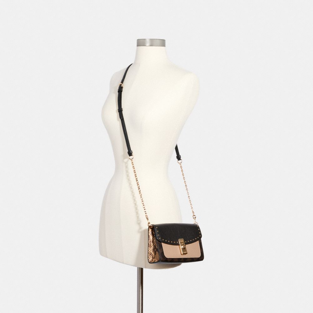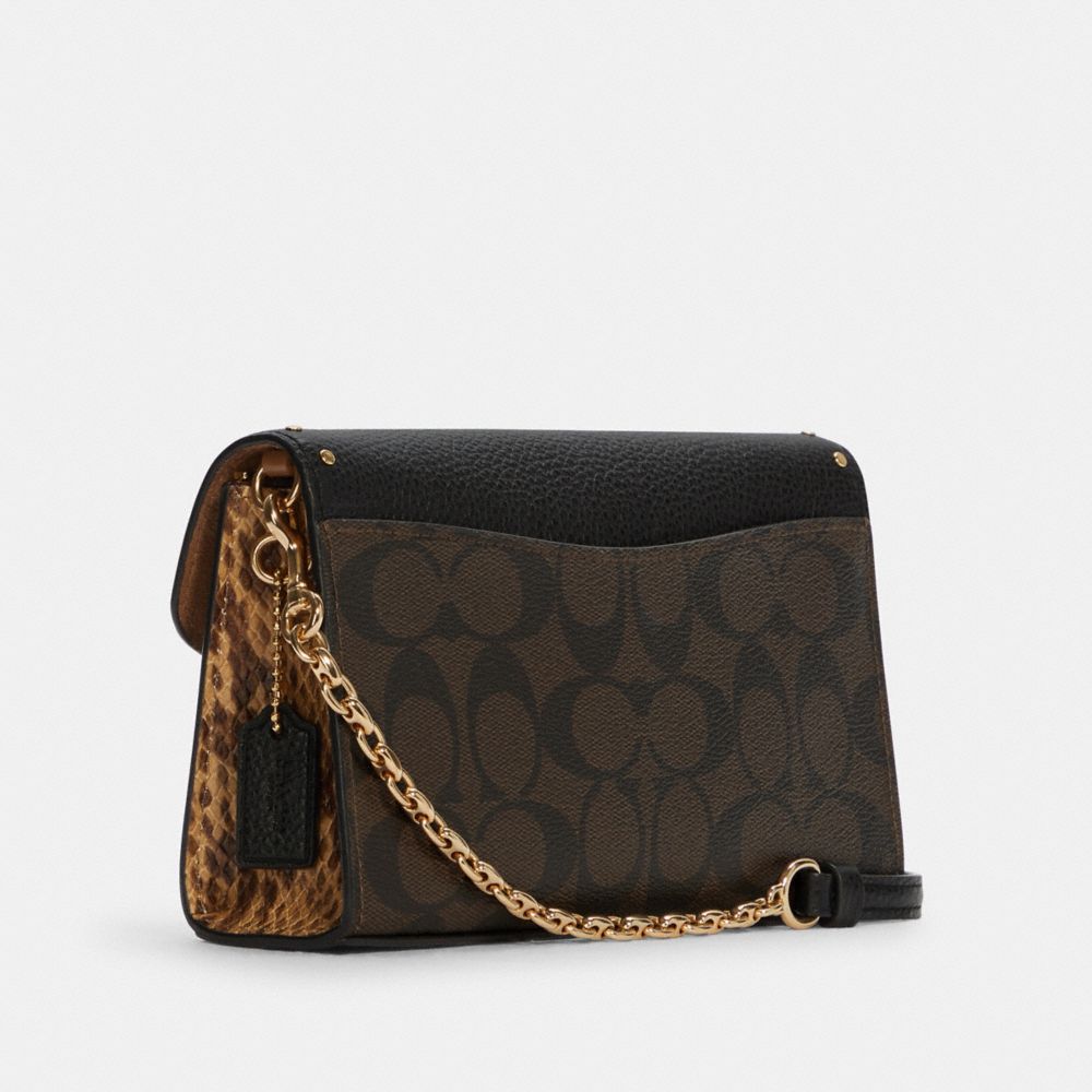 Signature coated canvas, refined pebble leather and snake-embossed leather| Eight credit card slots| Inside zip and multifunction pockets| Turnlock closure, fabric lining| Outside open pocket| Detachable strap with 22 3/4" drop for shoulder or crossbody wear| 7 3/4" (L) x 4 3/4" (H) x 2" (W)Style No. C1723