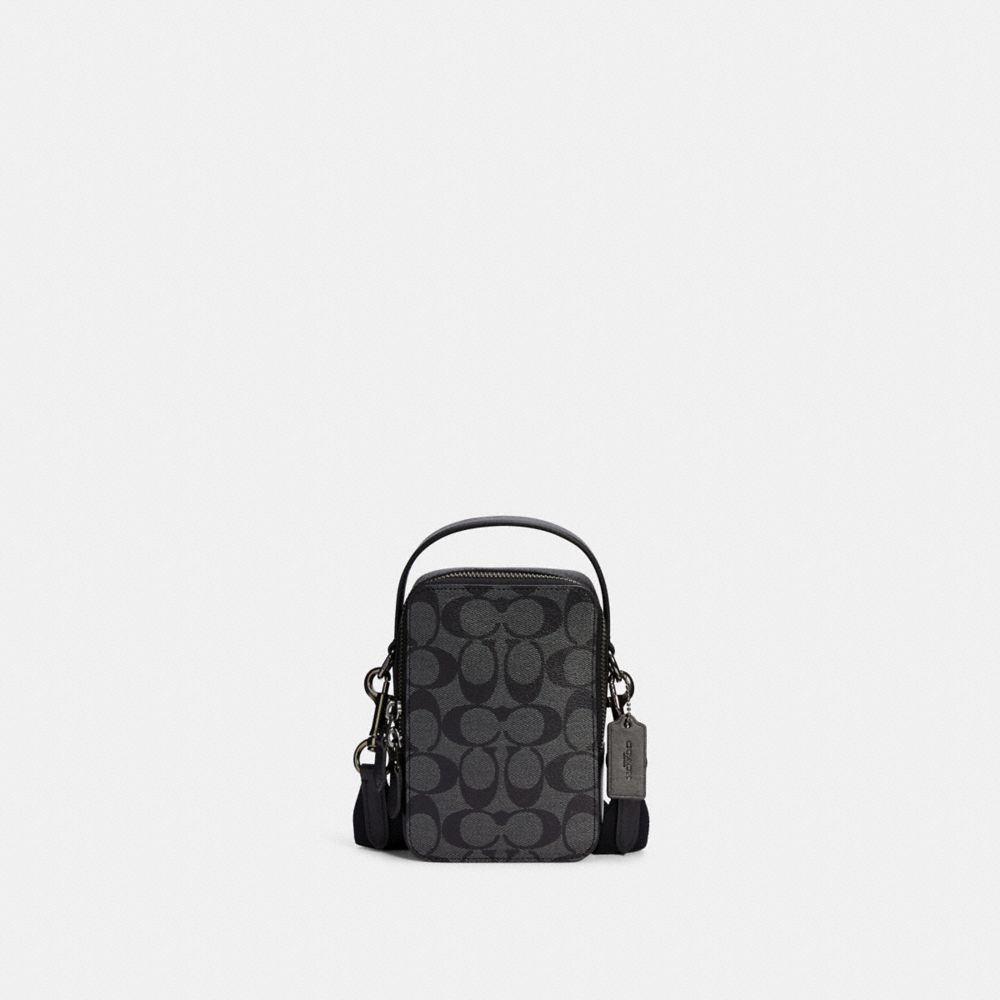 Signature coated canvas and refined calf leather| Three credit card slots| Zip closure, fabric lining| Top handle with 1 1/4" drop| Detachable strap with 24" drop for shoulder or crossbody wear| 4 1/2" (L) x 6 1/2" (H) x 2 1/4" (W)