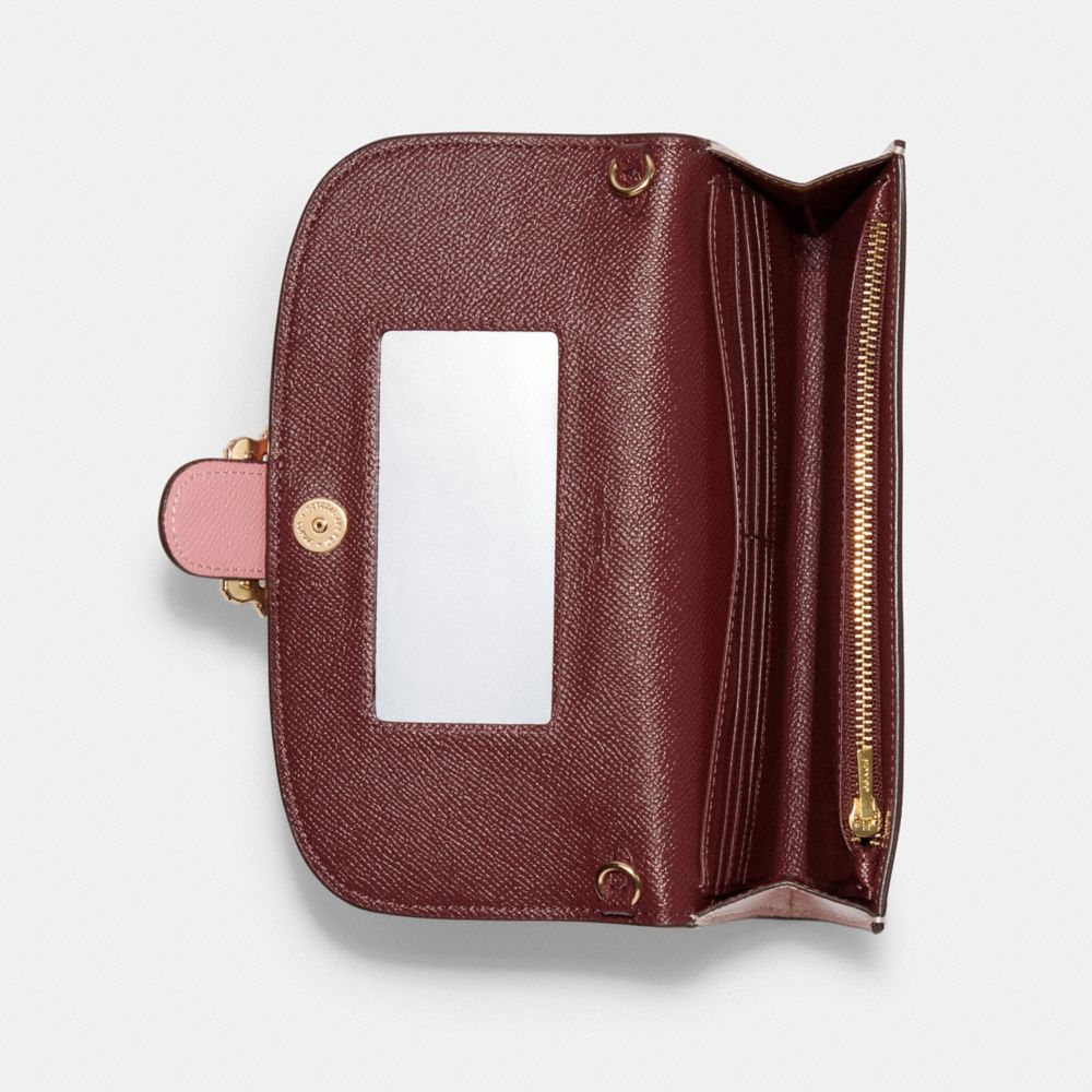 Crossgrain leather| Eight credit card slots| Full-length bill compartment| Inside zip and multifunction pockets| Inside mirror| Snap closure| Outside open pocket| Detachable wrist strap| Detachable chain strap with 23" drop for shoulder or crossbody wear| 7 3/4" (L) x 5" (H) x 1" (W)