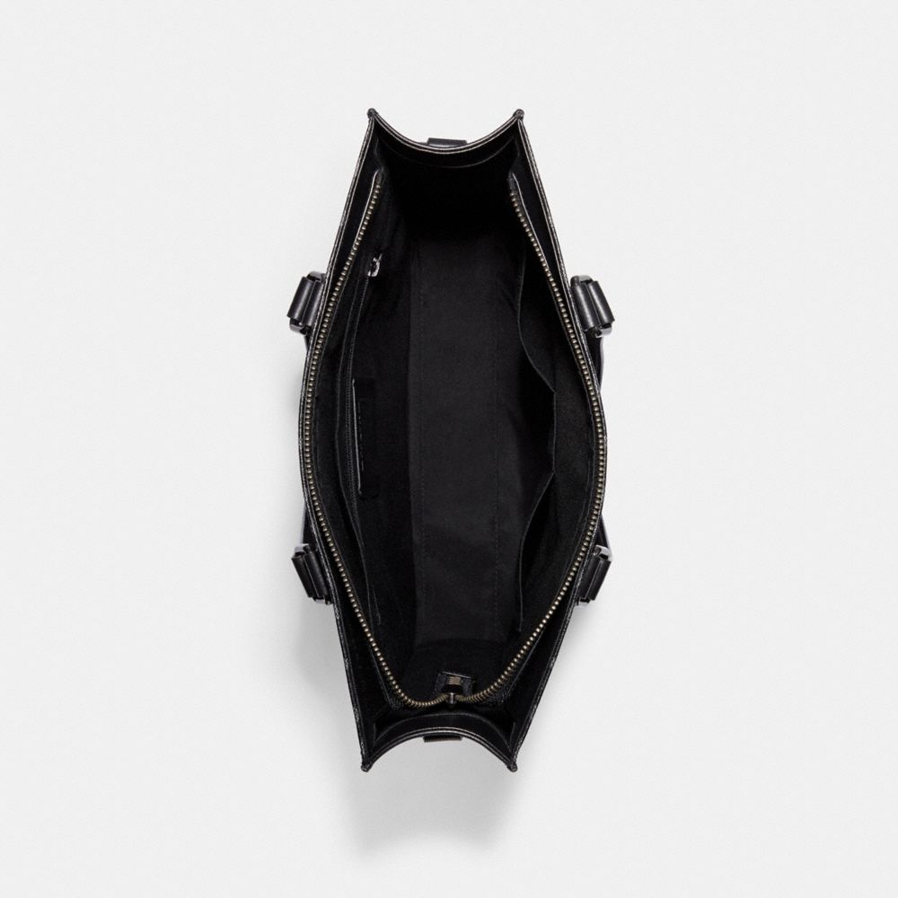 Signature coated canvas and refined calf leather| Inside zip, cell phone and multifunction pockets| Zip-top closure, fabric lining| Handles with 7 3/4" drop| Detachable strap with 25" drop for shoulder or crossbody wear| 14" (L) x 14 1/2" (H) x 3 1/4" (W)