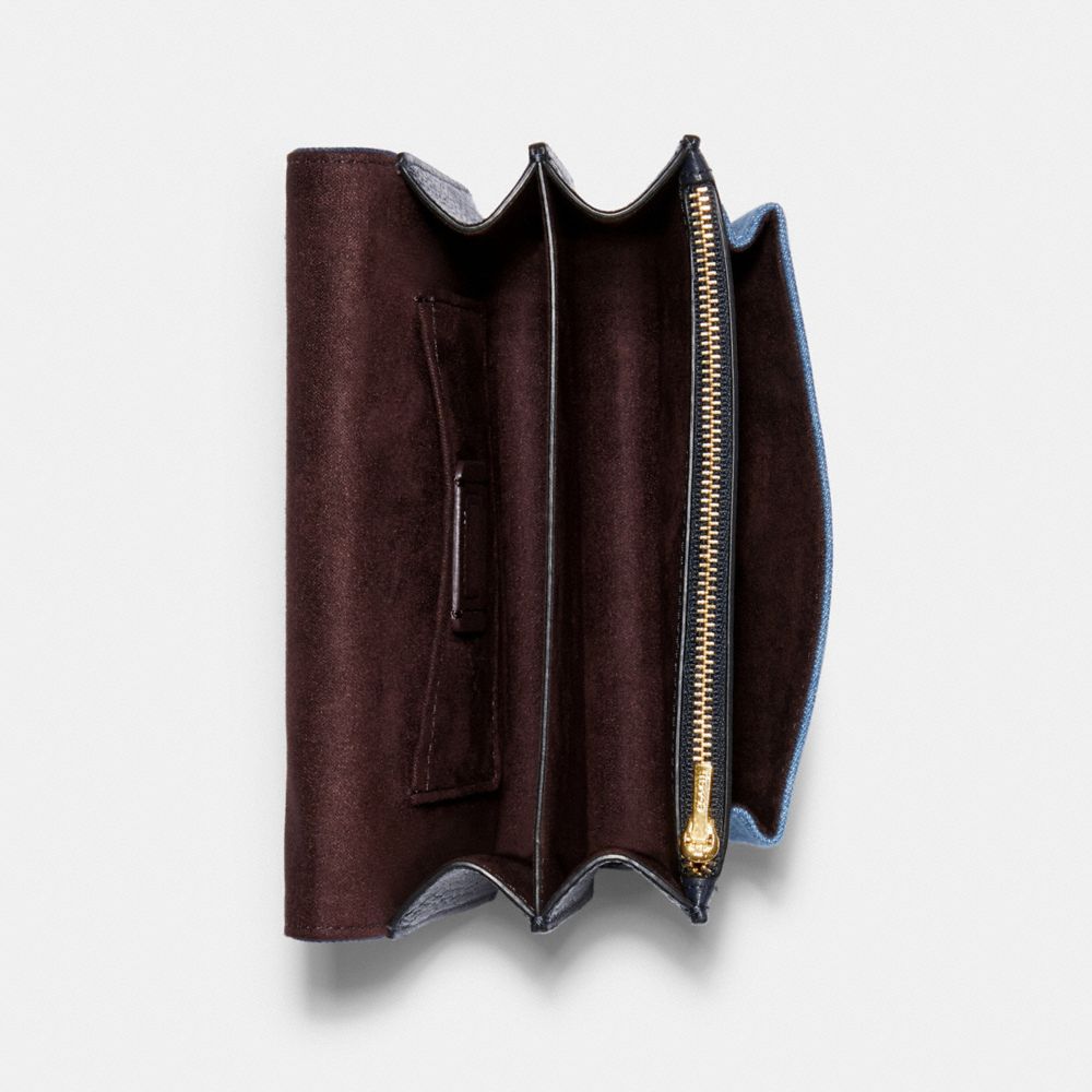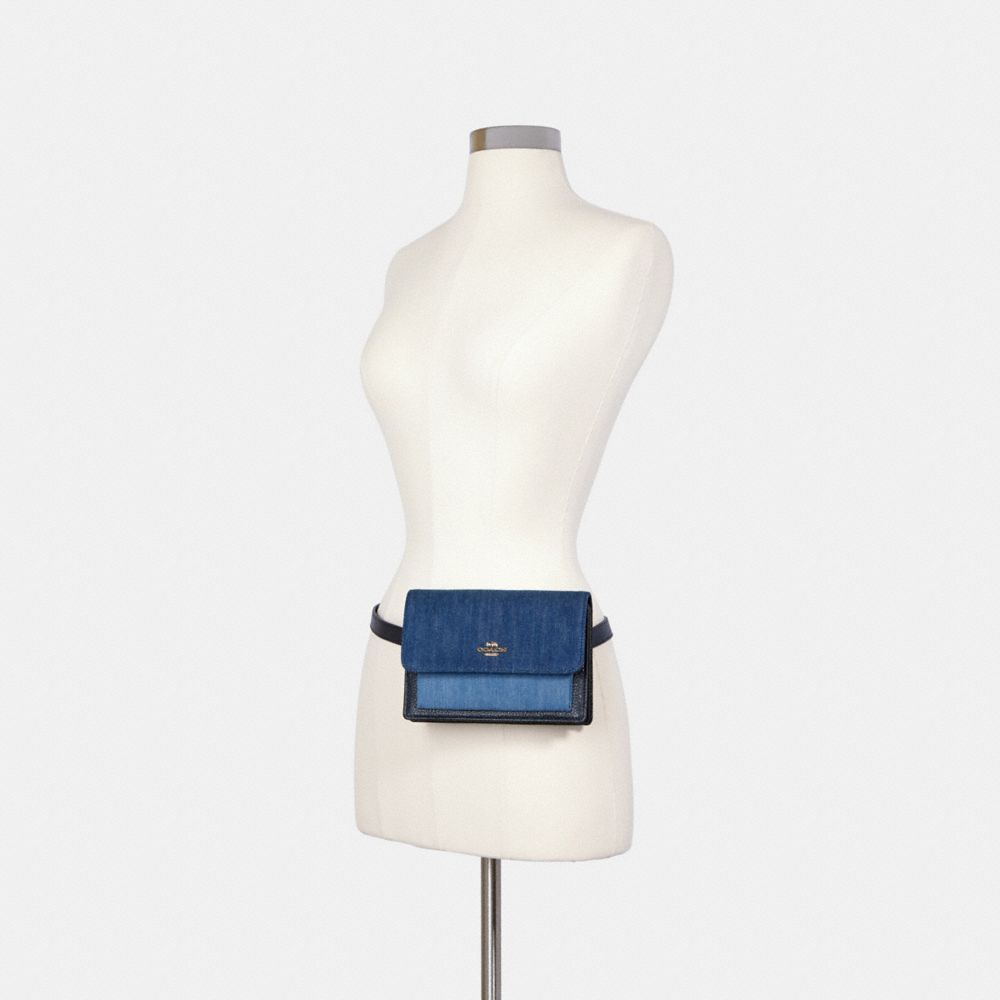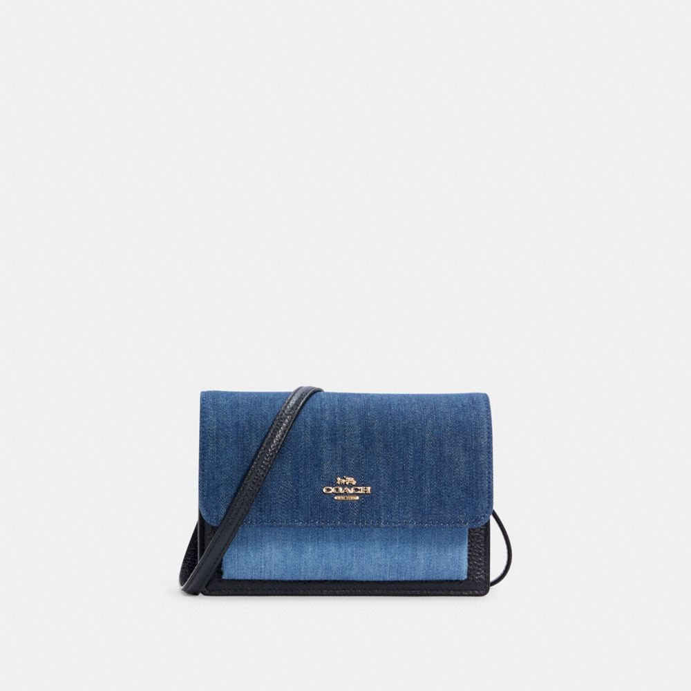 Denim and refined pebble leather| Inside zip and multifunction pockets| Snap closure, fabric lining| Adjustable strap for wear at waist| Detachable strap with 23 1/2" drop for shoulder or crossbody wear| 7" (L) x 5" (H) x 2 1/4" (W)