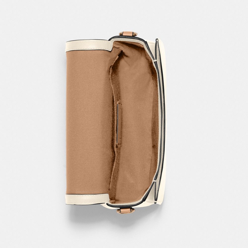 Printed coated canvas and smooth leather| Inside multifunction pockets| Magnetic snap closure, fabric lining| Outside open pocket| Detachable strap with 22" drop for shoulder or crossbody wear| 8" (L) x 6" (H) x 3 1/4" (W)