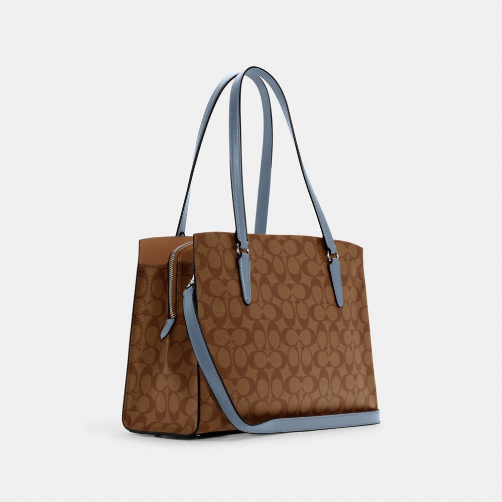 Signature coated canvas and smooth leather| Fits a 13" laptop| Inside cell phone and multifunction pockets| Zip closure, fabric lining| Side open compartments| Handles with 9" drop| Detachable strap with 19 1/2" drop for shoulder or crossbody wear| Four protective feet at base| 13 3/4" (L) x 10 1/4" (H) x 5 3/4" (W)Style No. C4075