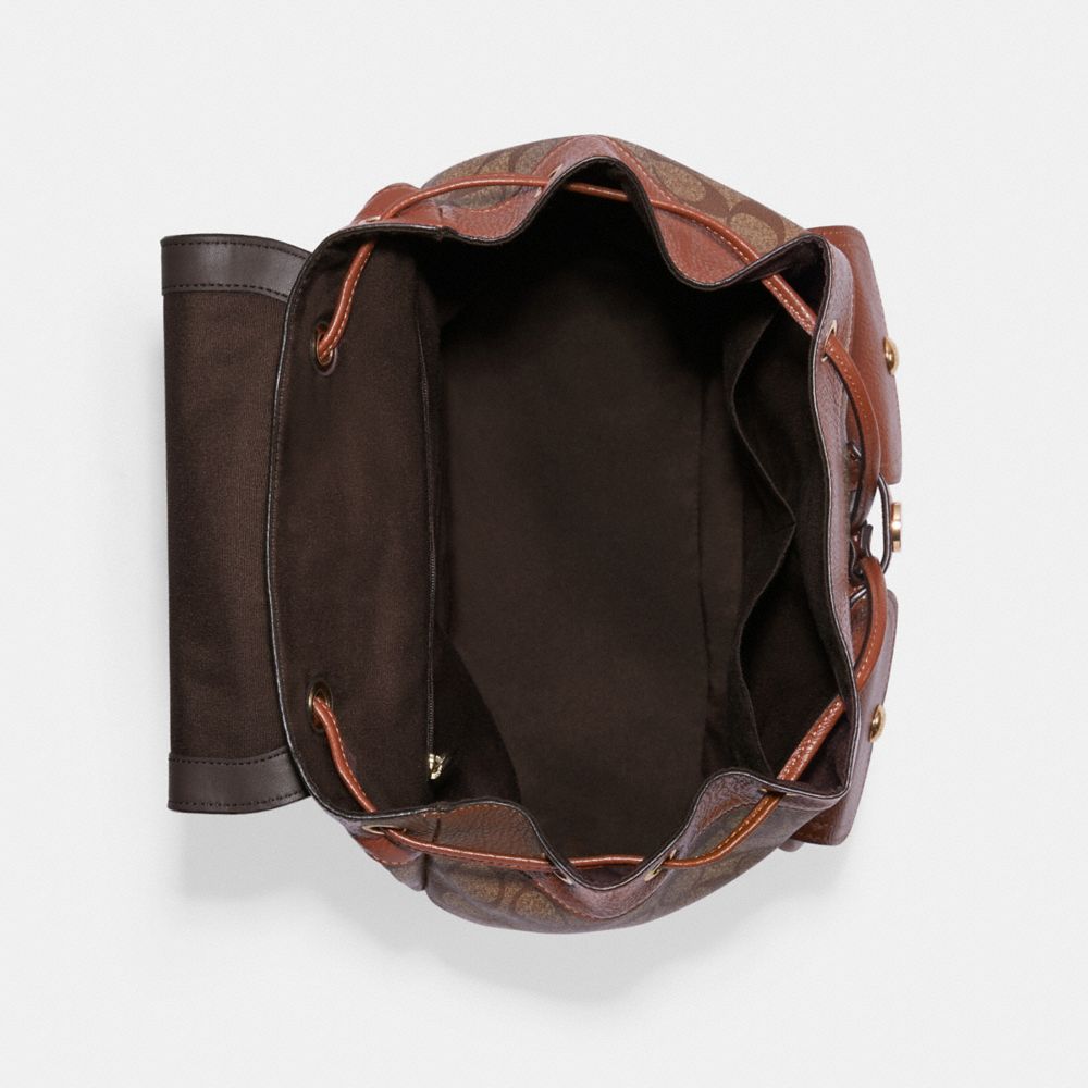 Signature coated canvas and refined pebble leather| Inside zip, cell phone and multifunction pockets| Drawstring and snap closures, fabric lining| Handle with 2 1/4" drop| Outside snap pockets| Adjustable shoulder straps| 12 1/2" (L) x 12 1/4" (H) x 5 1/2" (W)