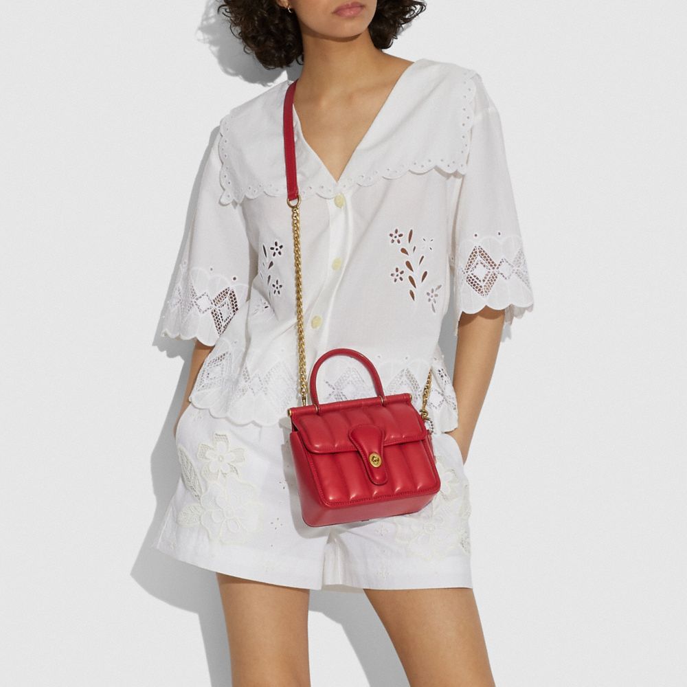 Nappa leather| One credit card slot| Inside zip and multifunction pockets| Turnlock closure, fabric lining| Top handle with 3" drop| Outside slip pocket| Detachable strap with 21 1/2" drop for shoulder or crossbody wear| 7" (L) x 6 1/2" (H) x 3 3/4" (W)| The Coach OriginalsStyle No. C4711
