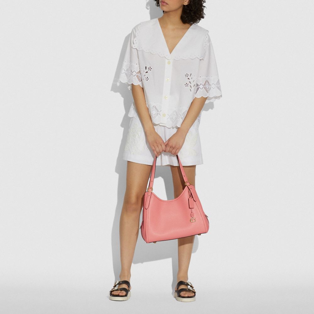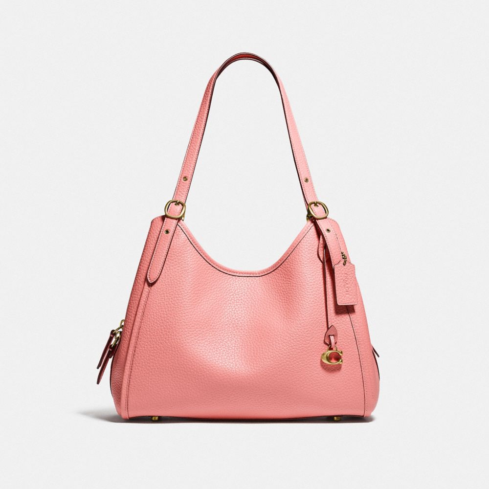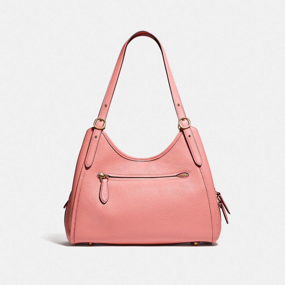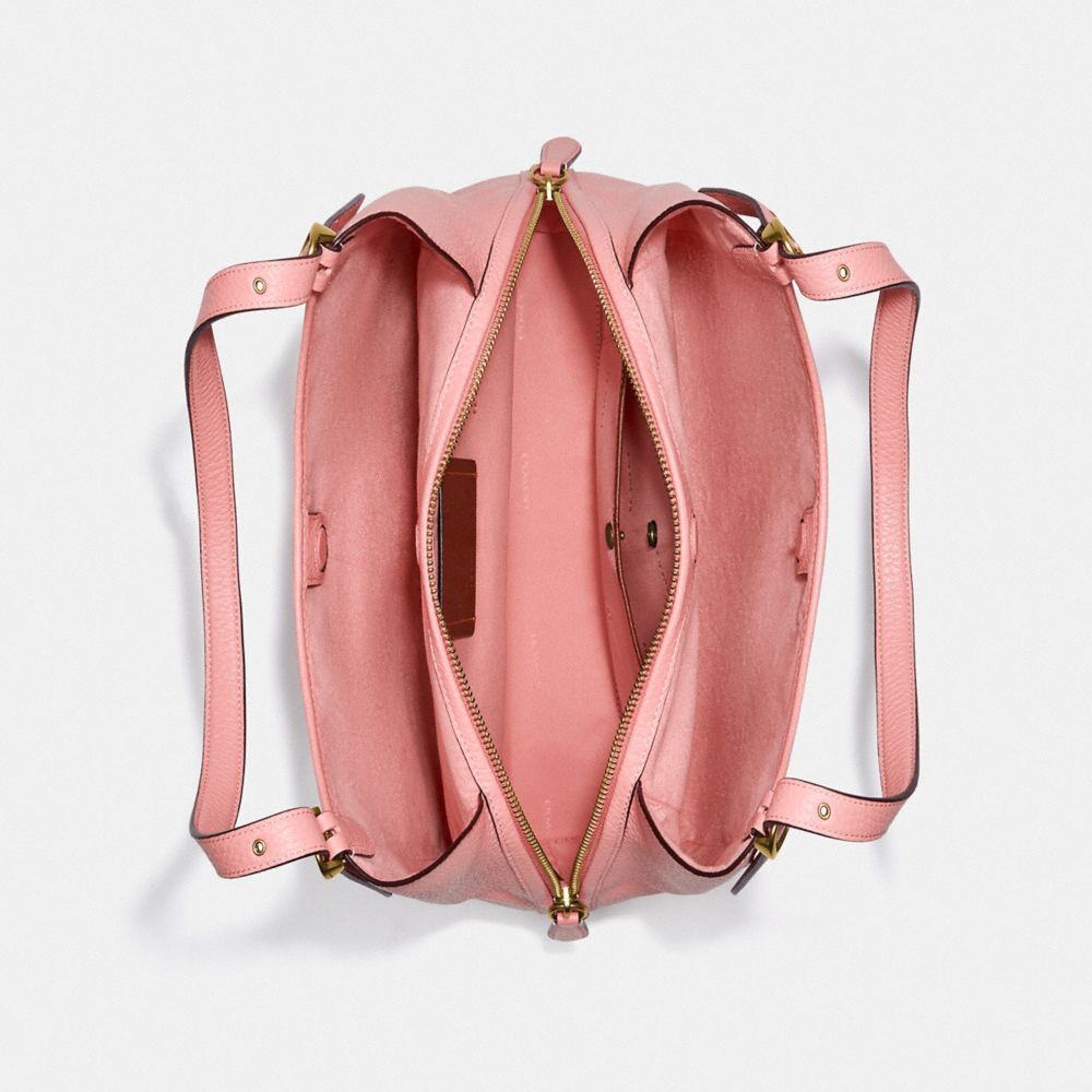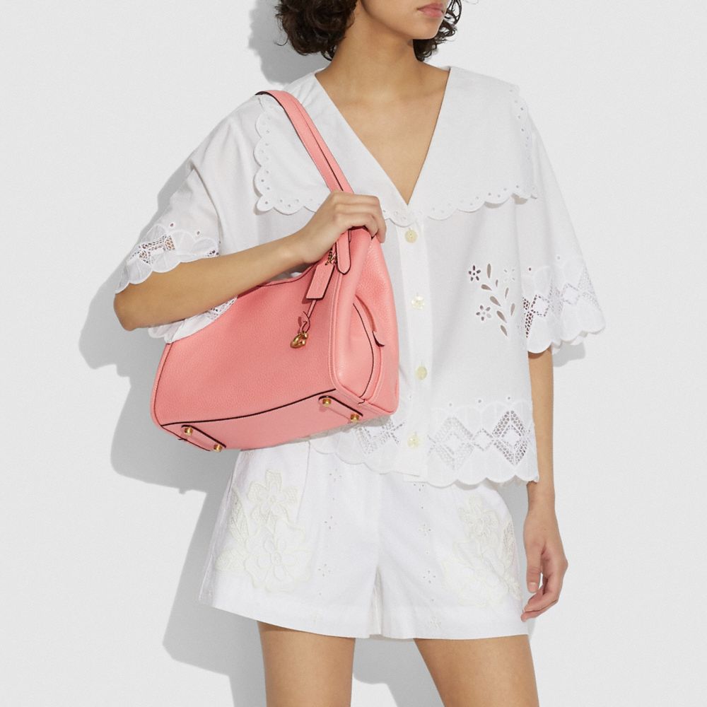Soft pebble leather| Inside snap pocket| Center zip compartment| Magnetic snap closure, fabric lining| Adjustable handles with 11" drop| Outside zip pocket| Four protective feet at base| 12 1/4" (L) x 10 1/4" (H) x 6" (W)Style No. C4824