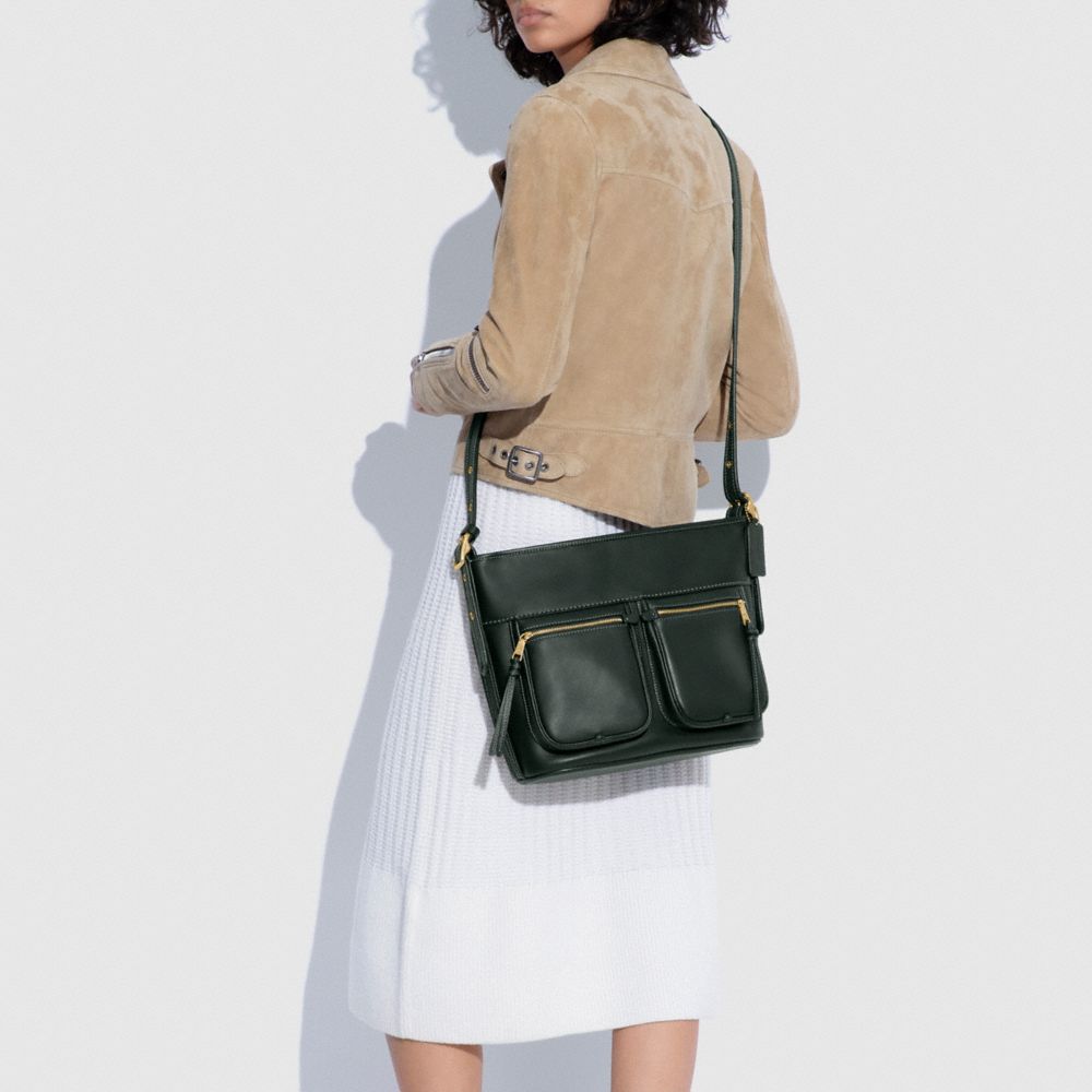 Glovetanned leather| Inside zip pocket| Zip-top closure, fabric lining| Outside zip pockets| Adjustable strap with 21 1/2" drop and 9 1/2" drop when doubled | 11 1/4" (L) x 10" (H) x 4 1/2" (W)Style No. C5433