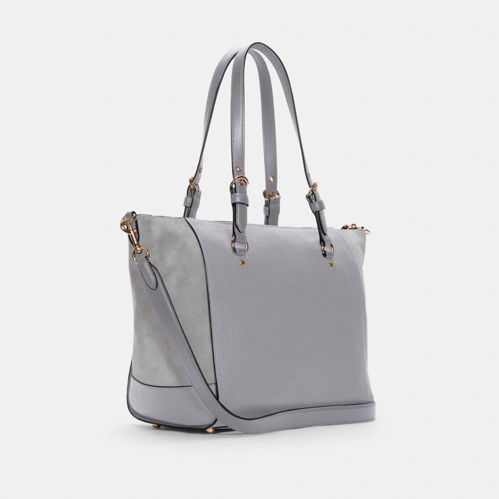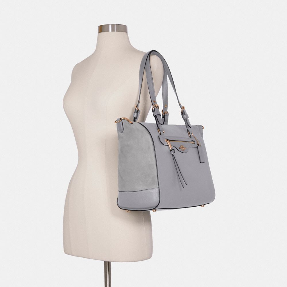 Refined pebble leather, smooth leather and suede| Inside zip, cell phone and multifunction pockets| Zip-top closure, fabric lining| Handles with 8 3/4" drop| Outside zip pocket| Detachable strap with 22" drop for shoulder or crossbody wear| Four protective feet at base| 11 3/4" (L) x 10 1/2" (H) x 6 1/2" (W)
