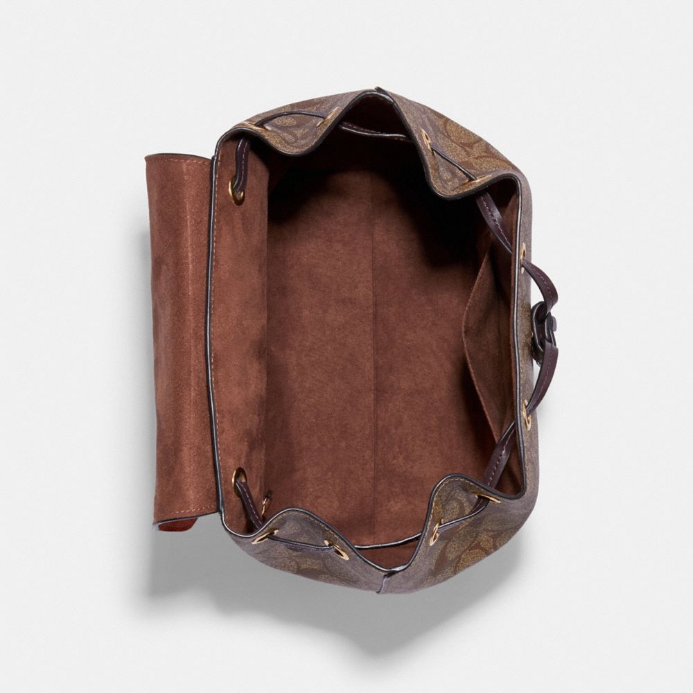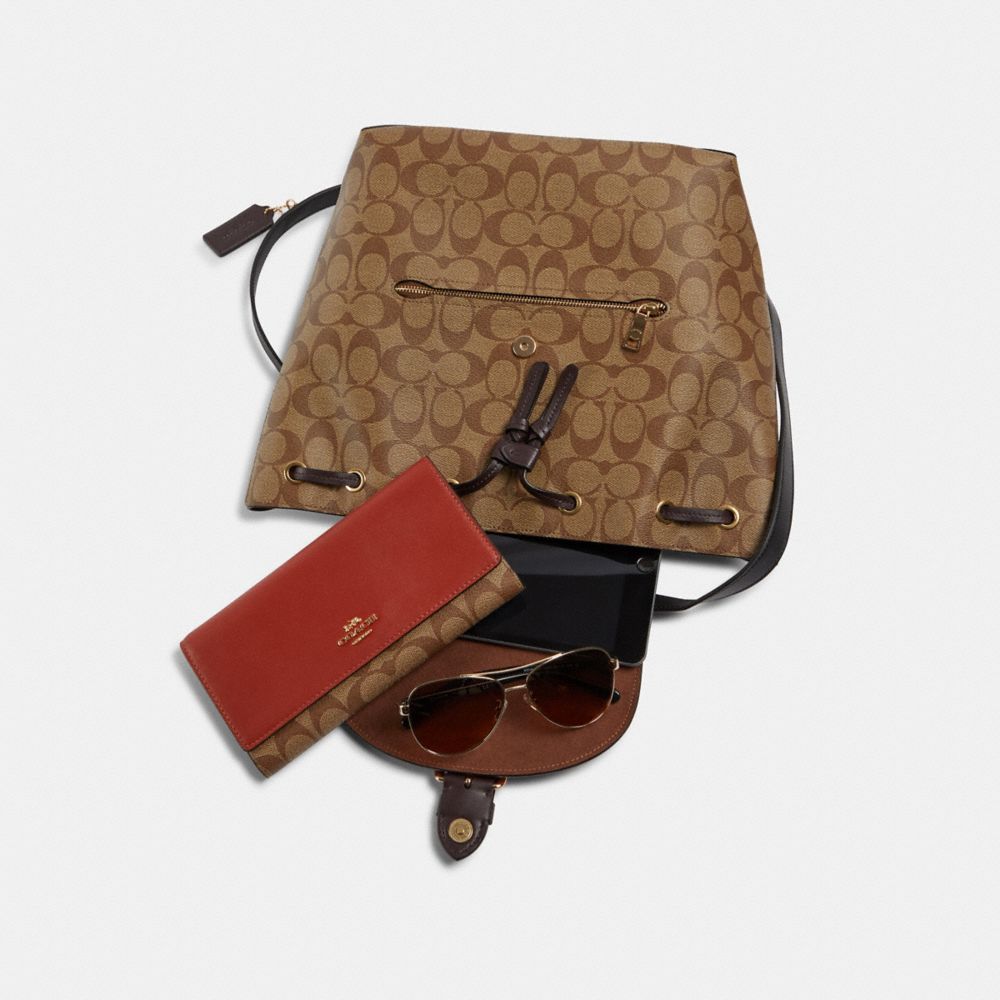 Signature coated canvas, suede and smooth leather| Inside zip and multifunction pockets| Snap closure, fabric lining| Handle with 3" drop| Outside zip pocket| Adjustable shoulder straps| 11" (L) x 11" (H) x 6 1/4" (W)