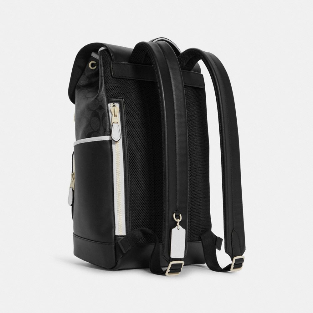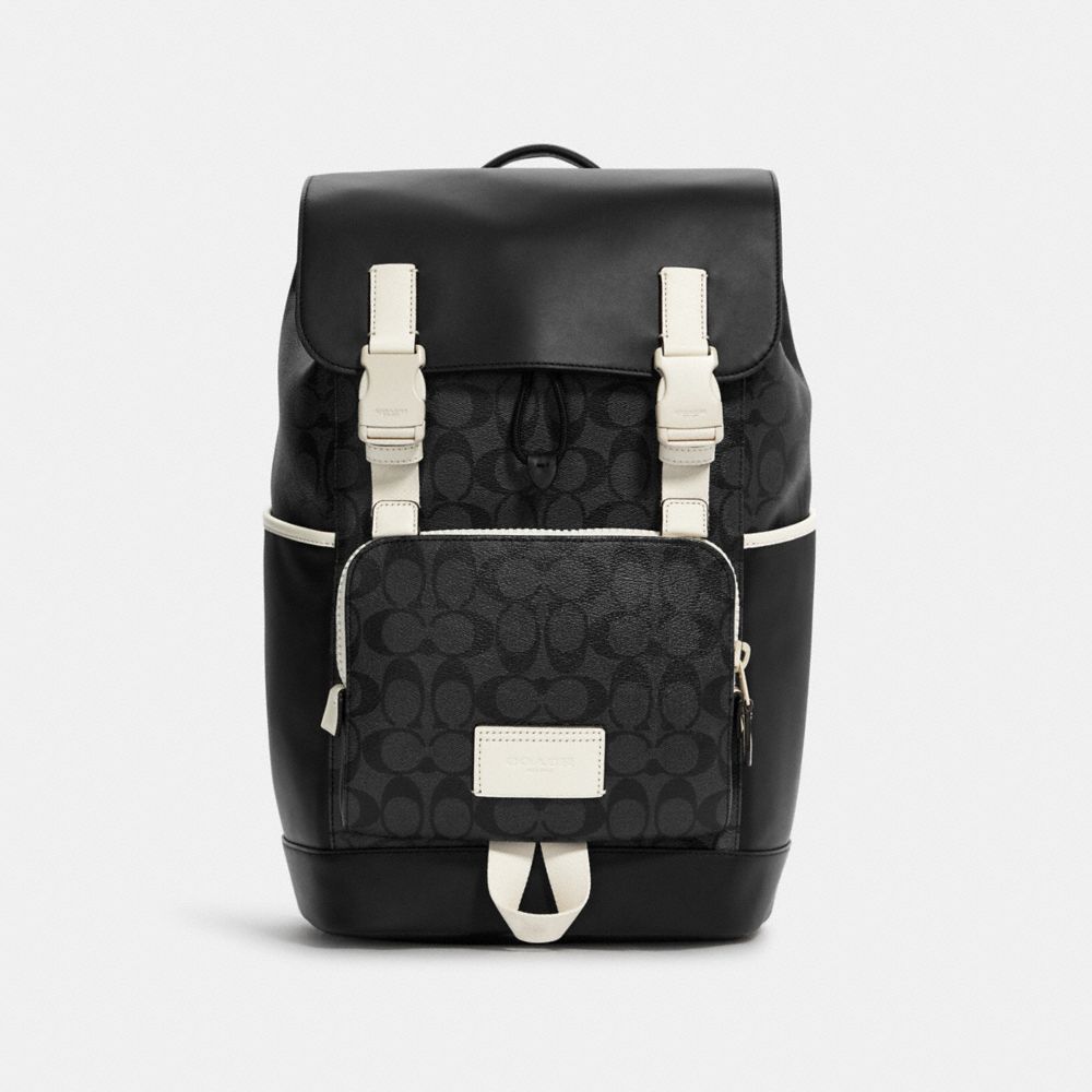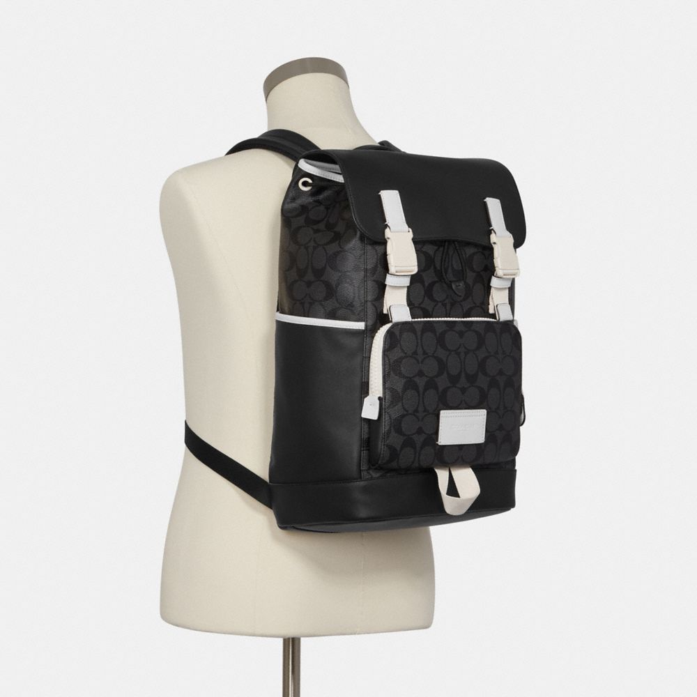 Signature coated canvas and smooth calf leather| Inside zip, cell phone and multifunction pockets| Inside tech sleeve| Drawstring and speedclip closures, fabric lining| Top handle with 2 1/4" drop| Outside zip and slip pockets| Outside zip access to interior| Adjustable shoulder straps| 10 1/2" (L) x 16 1/2" (H) x 6" (W)Style No. C6654
