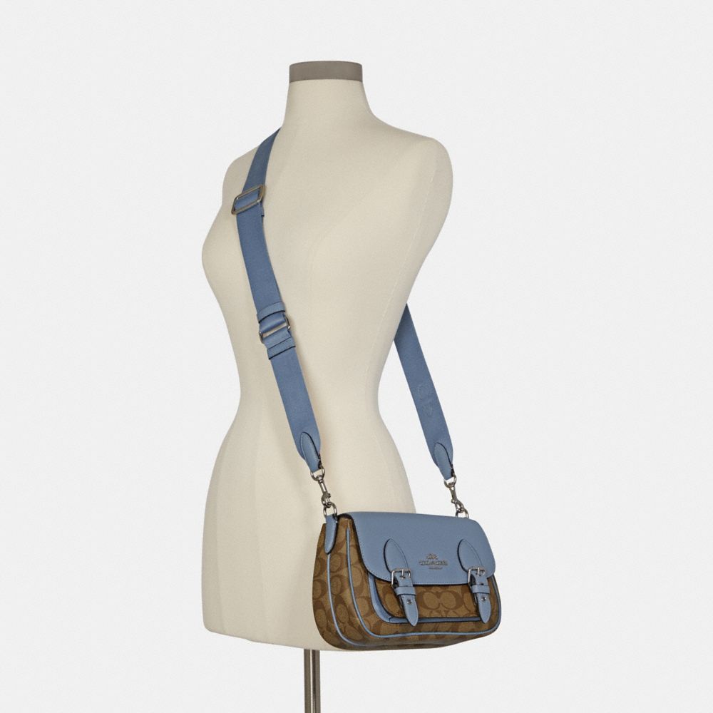 Signature coated canvas and refined pebble leather| Inside zip and multifunction pockets| Snap closure, fabric lining| Outside open pocket| Detachable strap with 25" drop for shoulder or crossbody wear| 8 3/4" (L) x 6 1/4" (H) x 3 1/4" (W)Style No. C6781