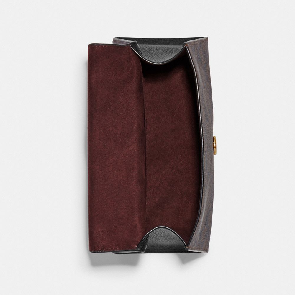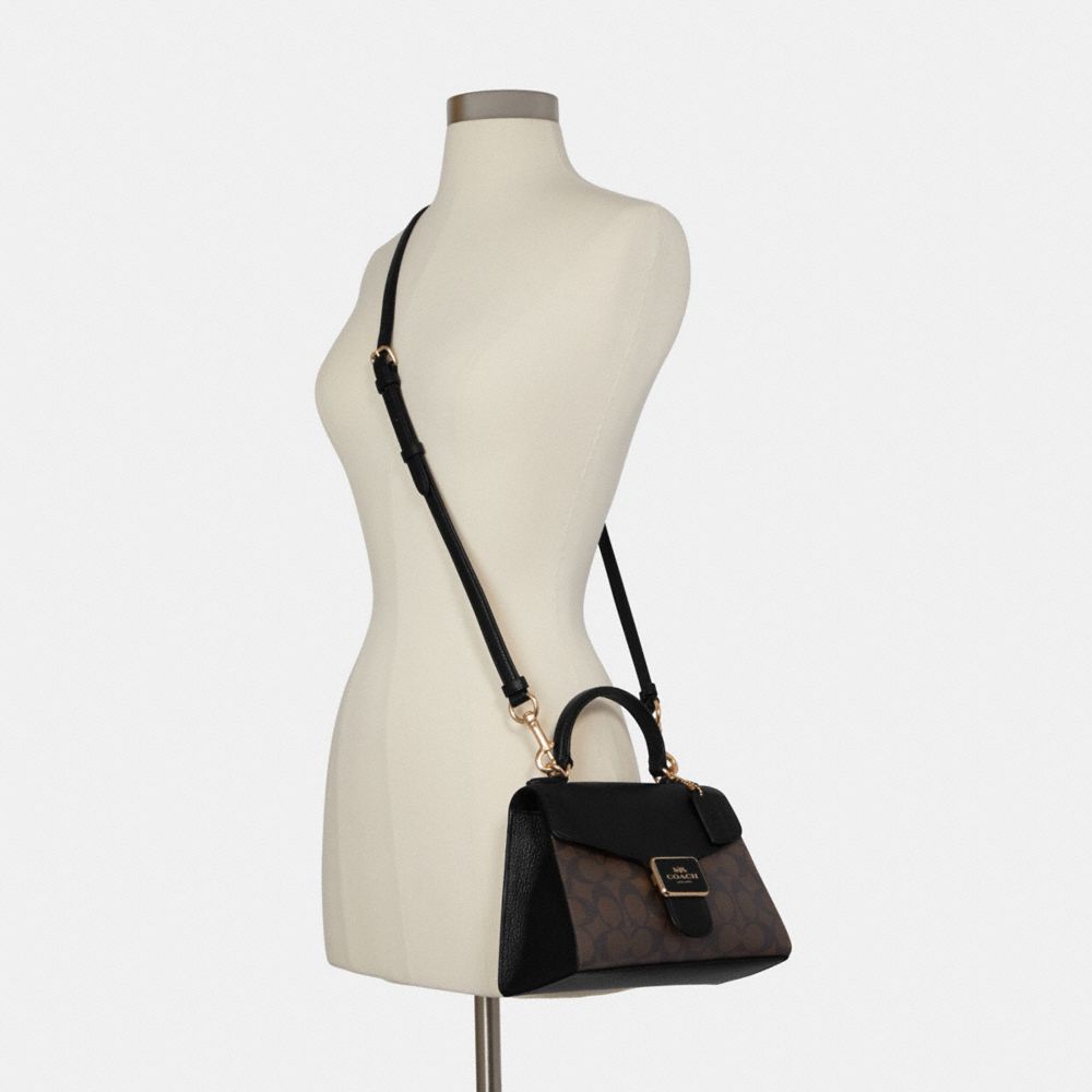 Signature coated canvas and refined pebble leather| Inside multifunction pocket| Snap closure, fabric lining| Top handle with 2 3/4" drop| Outside open pocket| Detachable strap with 22 1/2" drop for shoulder or crossbody wear| 8 3/4" (L) x 6" (H) x 4" (W)Style No. C7226