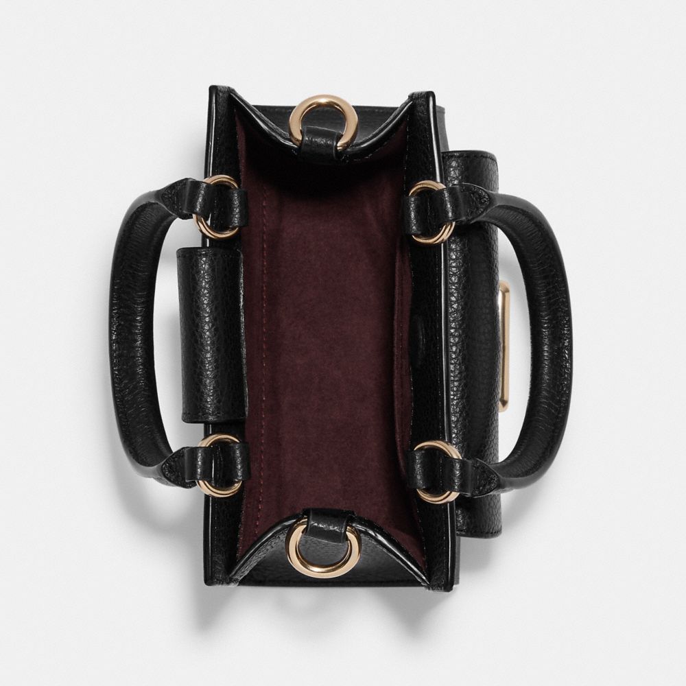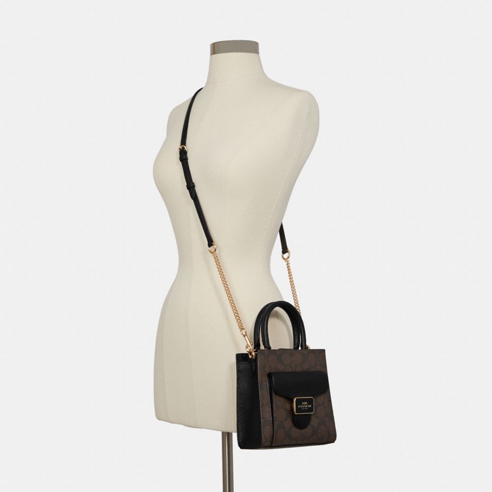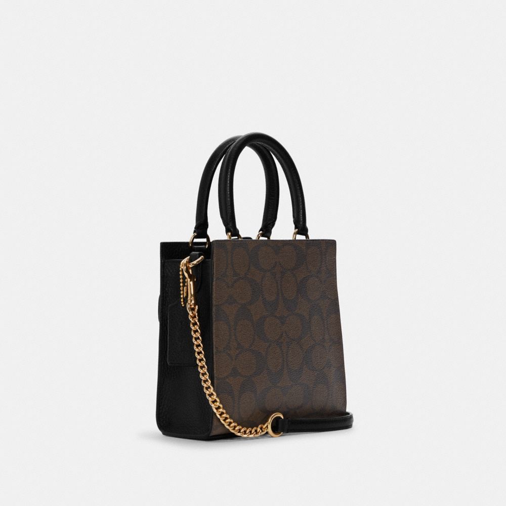 Signature coated canvas and refined pebble leather| Two credit card slots| Inside multifunction pocket| Magnetic snap closure, fabric lining| Handles with 3 3/4" drop| Outside flap pocket| Detachable strap with 23 1/2" drop for shoulder or crossbody wear| 6 3/4" (L) x 6 3/4" (H) x 3" (W)Style No. C7228