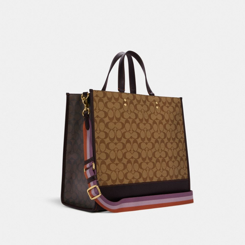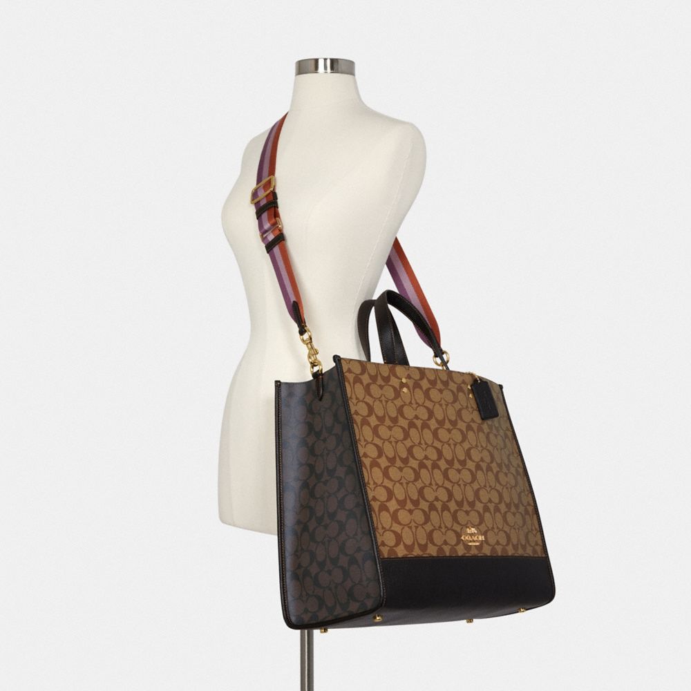 Signature coated canvas and refined pebble leather| Inside zip, cell phone and multifunction pockets| Snap closure, fabric lining| Handle with 6" drop| Detachable strap with 20 1/2" drop for shoulder or crossbody wear| 15 3/4" (L) x 14" (H) x 7 1/4" (W)Style No. C7239