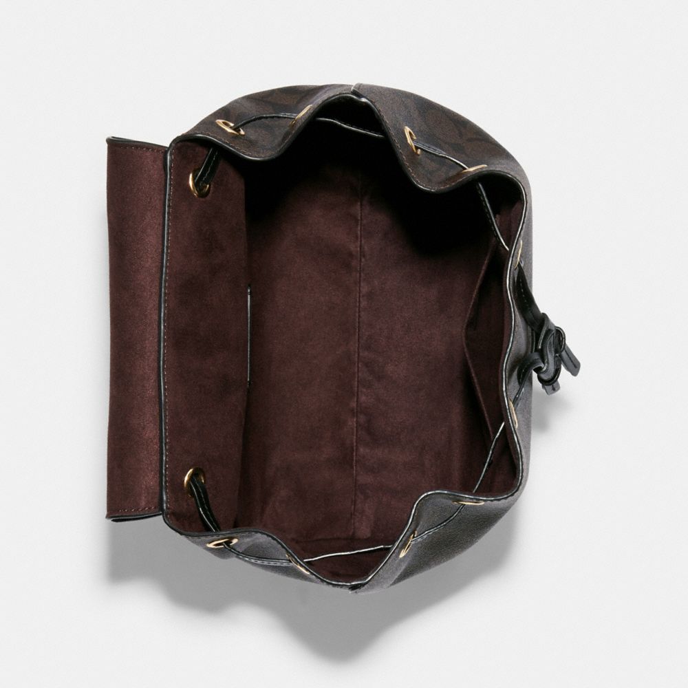 Signature coated canvas, smooth leather and suede| Inside zip and multifunction pockets| Snap closure, fabric lining| Handle with 3" drop| Outside zip pocket| Adjustable shoulder straps| 11" (L) x 11" (H) x 6 1/4" (W)Style No. C7251