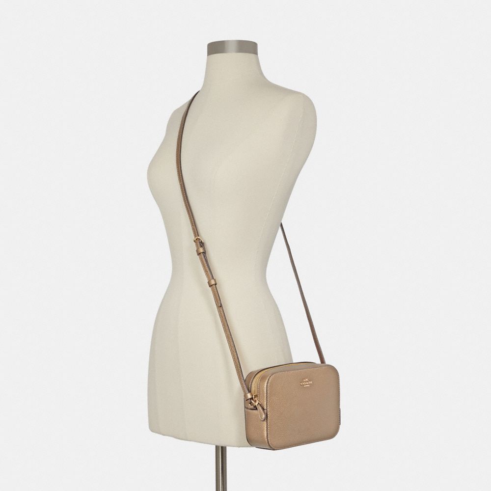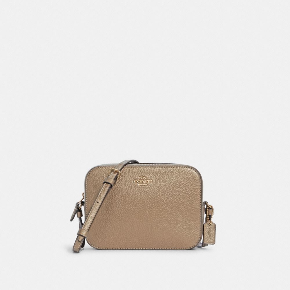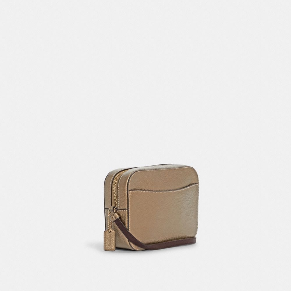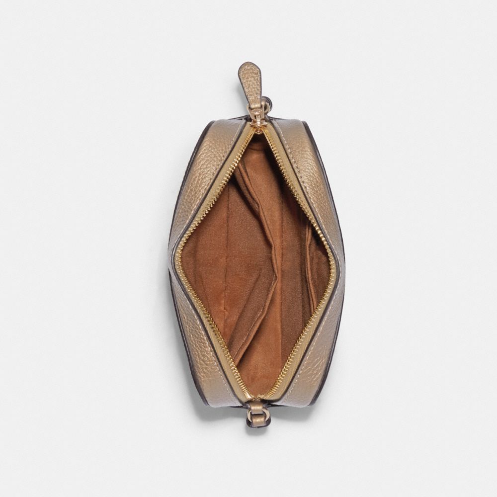 Metallic refined pebble leather and smooth leather| Two credit card slots| Inside multifunction pocket| Zip closure, fabric lining| Outside open pocket| Adjustable strap with 23" drop for shoulder or crossbody wear| 7 1/4" (L) x 5 1/4" (H) x 2" (H)Style No. C8093