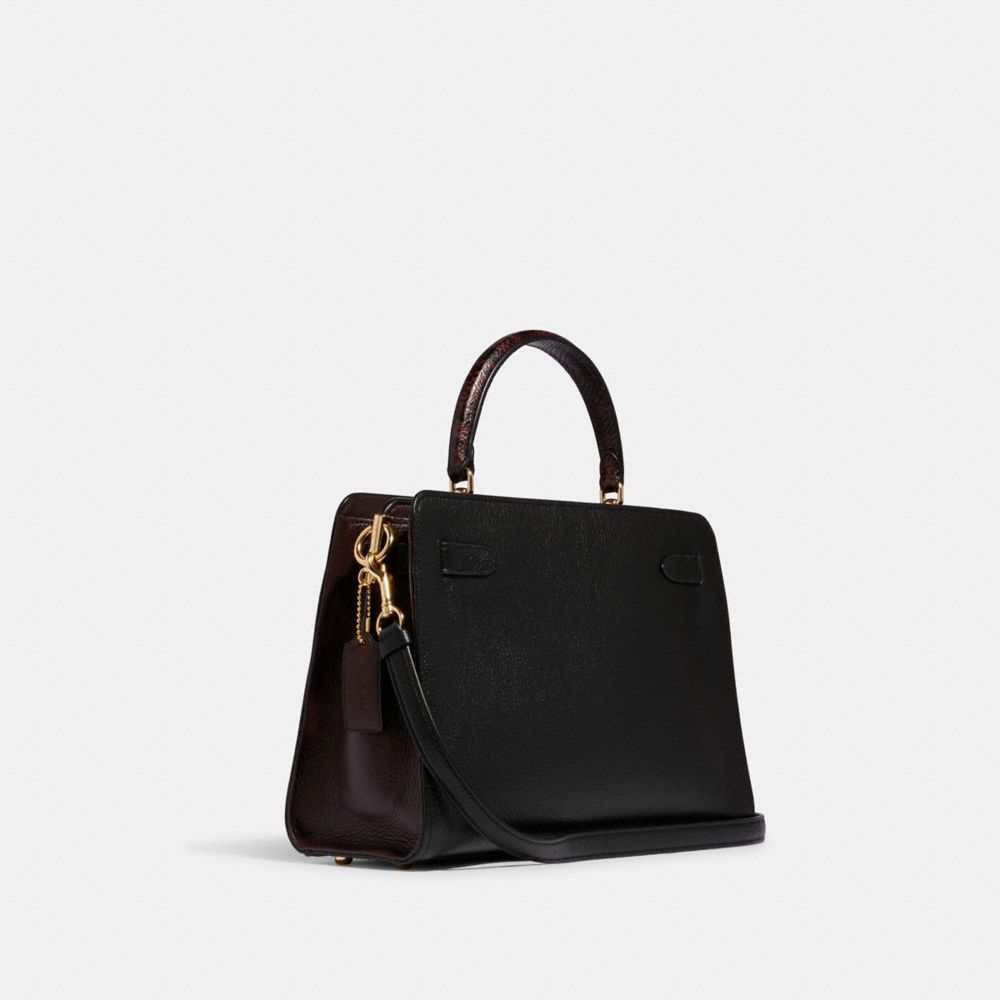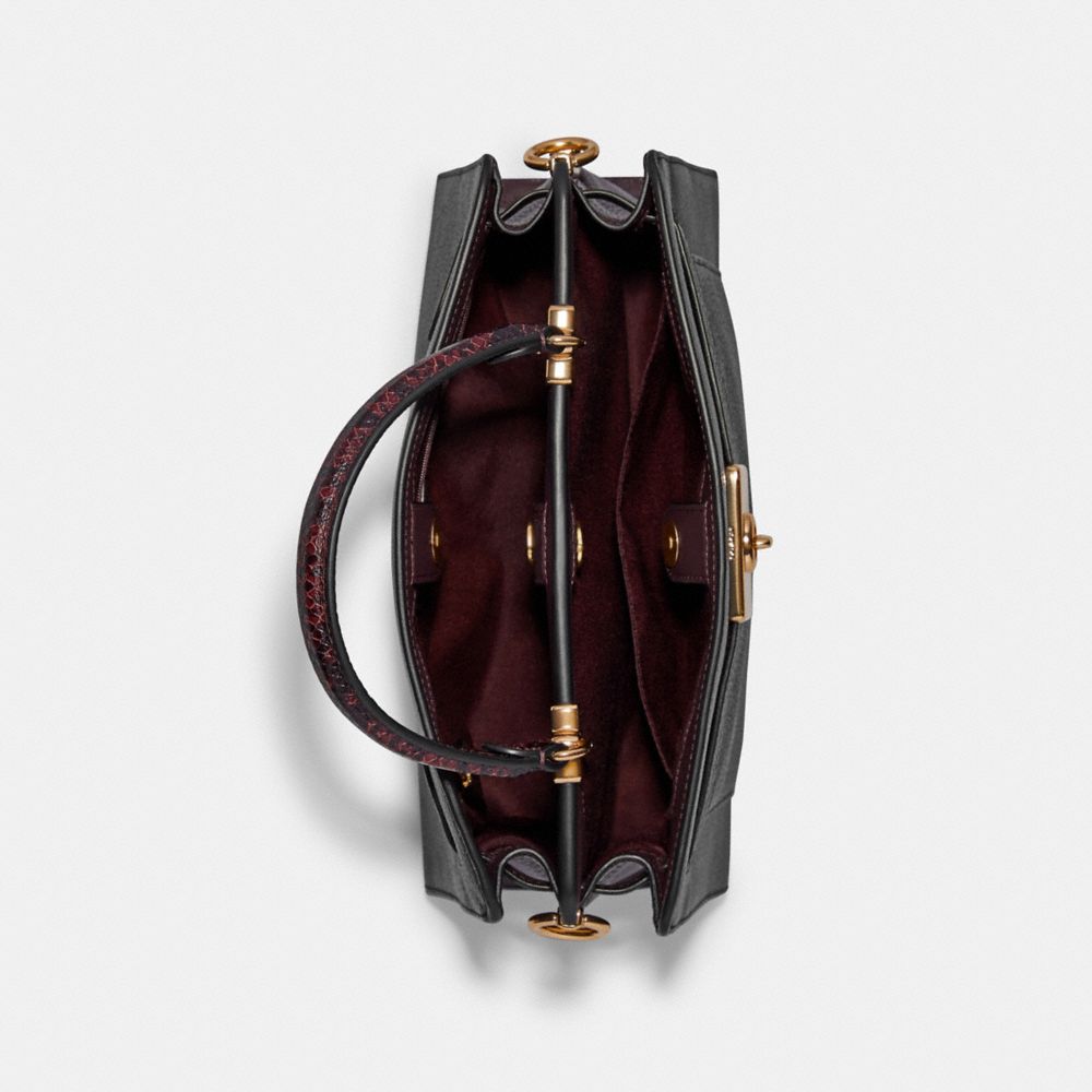 Refined pebble leather, smooth leather and snake-embossed leather| Inside zip and multifunction pockets| Snap closures, fabric lining| Handle with 4 1/4" drop| Outside open pocket| Detachable strap with 20 1/2" drop for shoulder or crossbody wear| Four protective feet at base| 12 1/2" (L) x 8 3/4" (H) x 4 3/4" (W)Style No. C8211