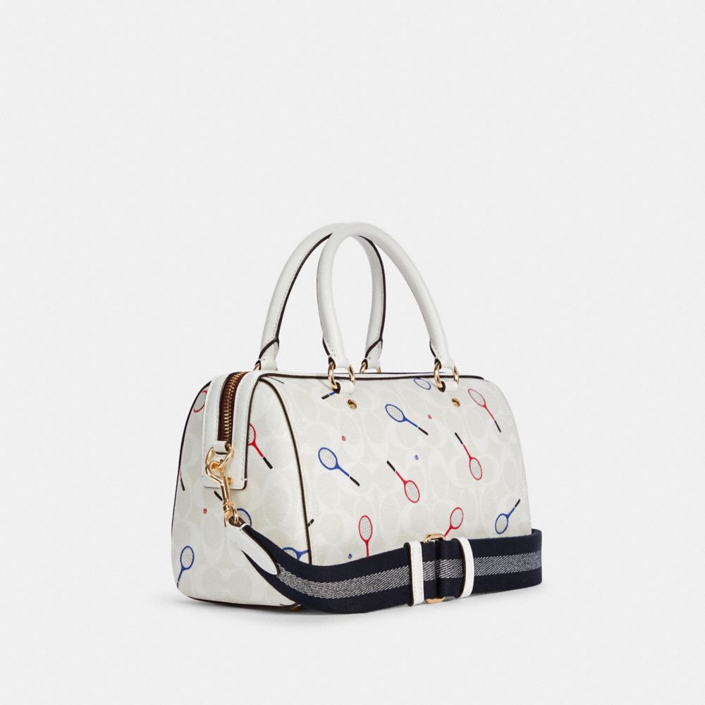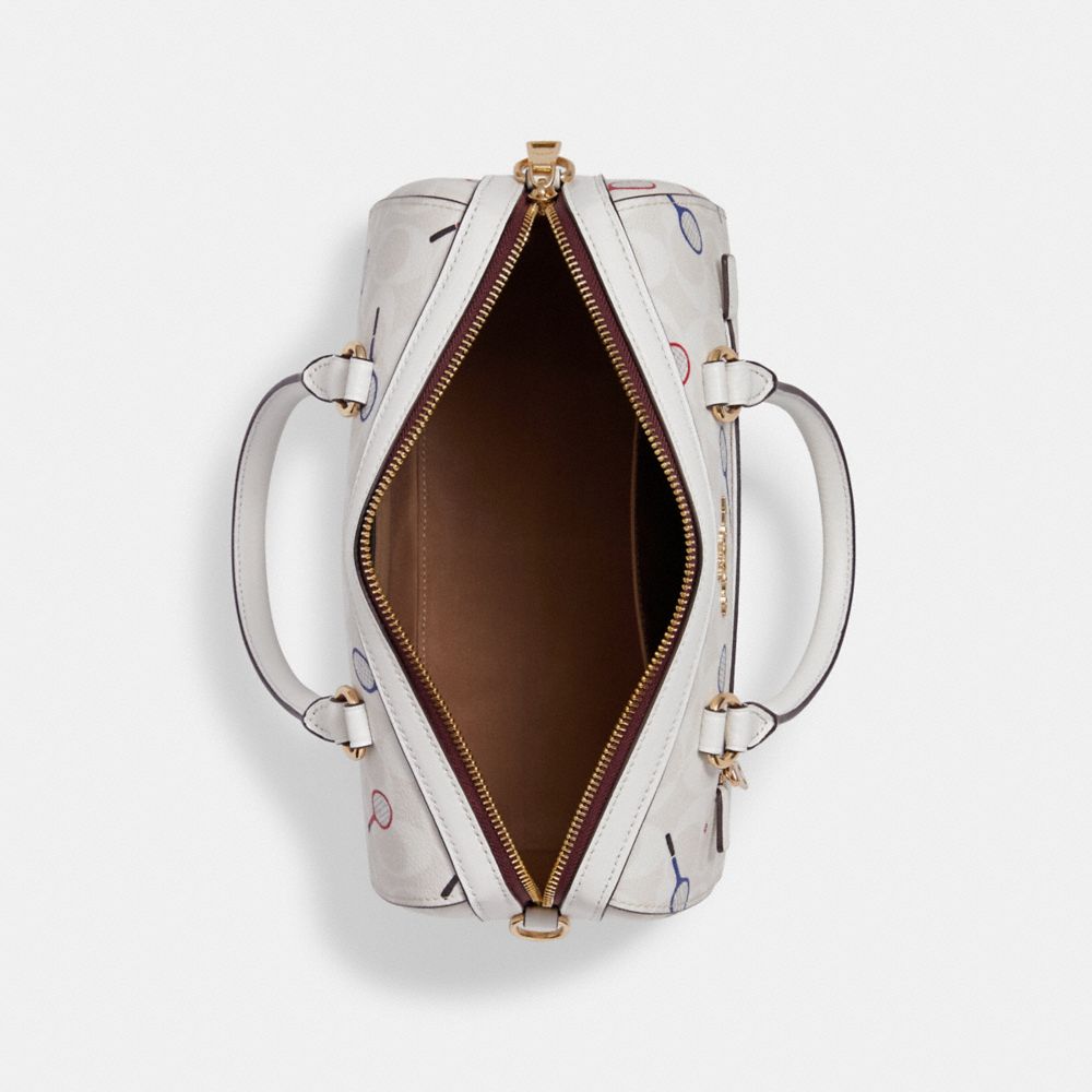 Signature coated canvas and smooth leather| Inside zip and multifunction pockets| Zip closure, fabric lining| Handles with 4 1/4" drop| Outside zip pocket| Detachable strap with 23" drop for shoulder or crossbody wear| Four protective feet at base| 10 1/2" (L) x 6 1/4" (H) x 5 1/2" (W)Style No. C8285