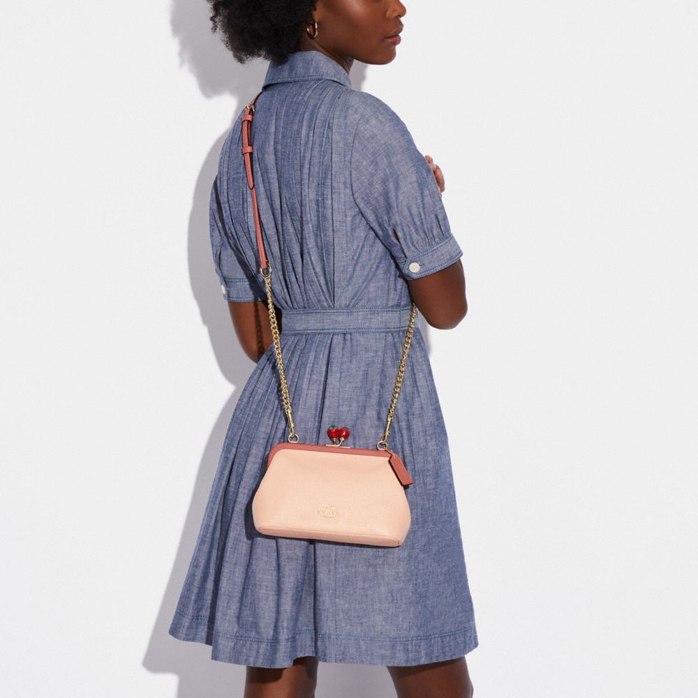 Refined pebble leather and smooth leather| Inside multifunction pocket| Kisslock closure, fabric lining| Detachable strap with 22 3/4" drop for shoulder or crossbody wear| 8 1/2" (L) x 5 1/2" (H) x 3" (W)Style No. C8288