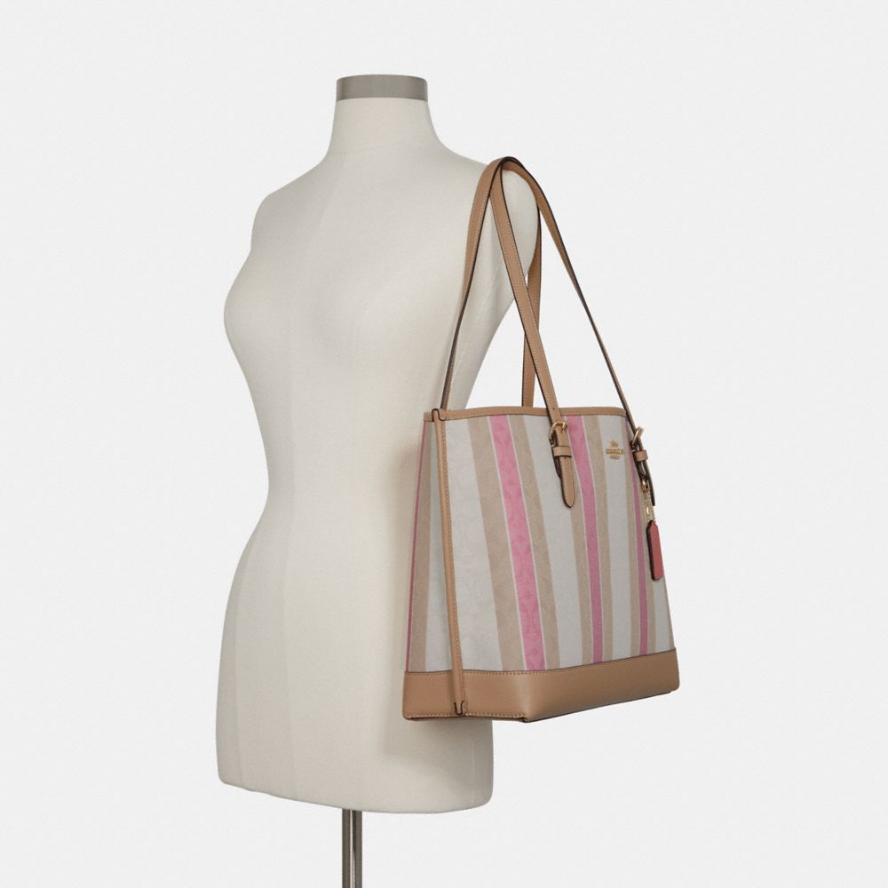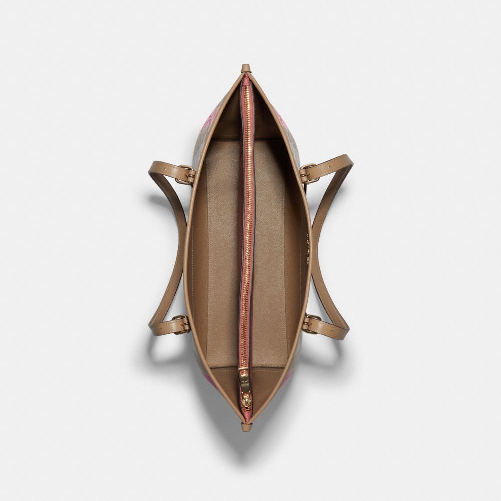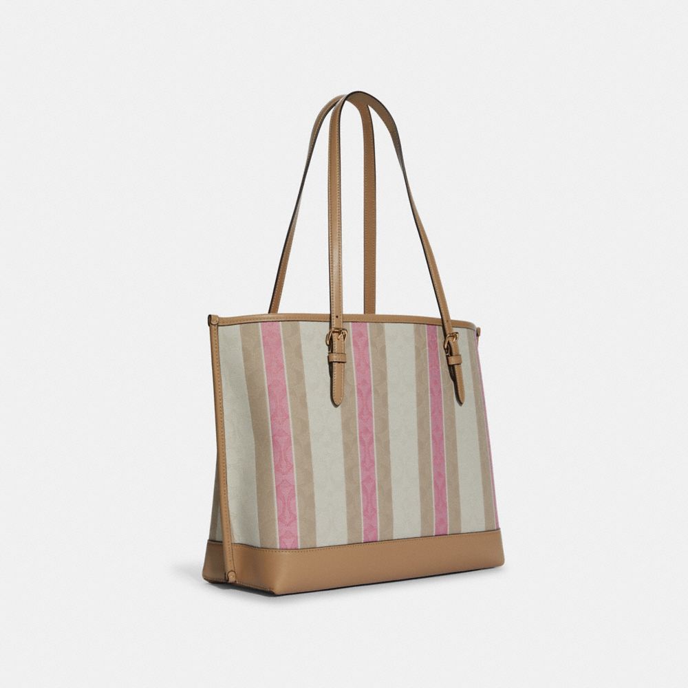 Signature jacquard and smooth leather| Inside multifunction pocket| Zip-top closure, fabric lining| Handles with 10 1/4" drop| Side open compartments| 13 1/4" (L) x 11" (H) x 5" (W)Style No. C8415