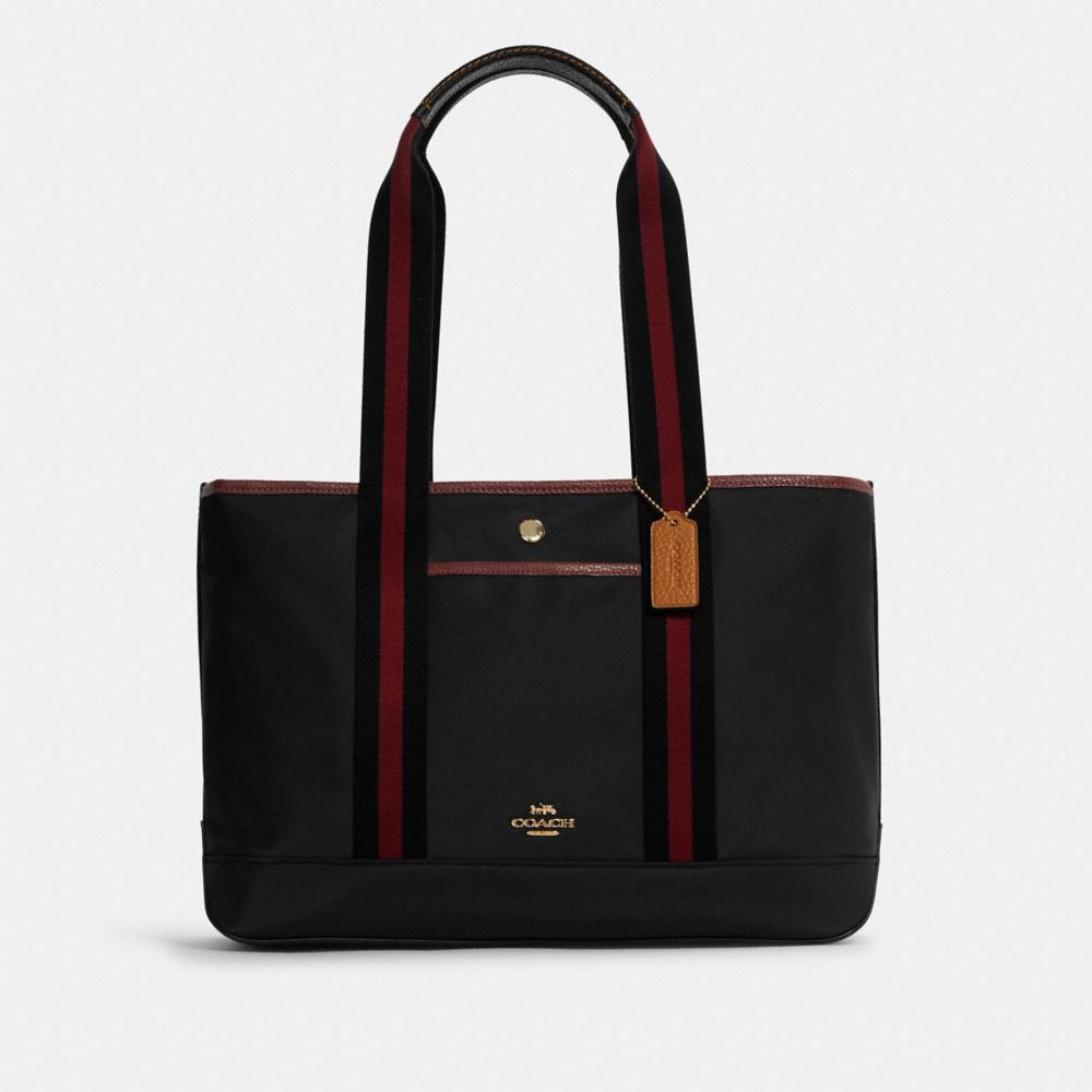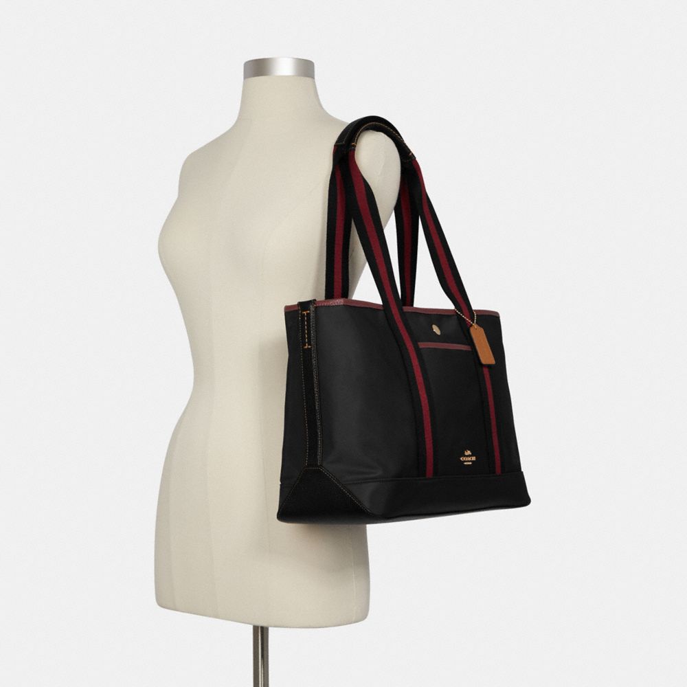 Recycled nylon and refined calf leather| Inside zip, cell phone and multifunction pockets| Zip-top closure, fabric lining| Handles with 10" drop| Outside open pockets| 16" (L) x 10 1/4" (H) x 6" (W)Style No. C9441