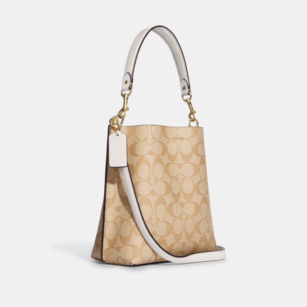 Signature coated canvas and smooth leather| Center zip compartment| Snap closure| Detachable handle with 6 3/4" drop| Detachable strap with 22" drop for shoulder or crossbody wear| 8" (L) x 8 1/2" (H) x 4" (W)Style No. CA582