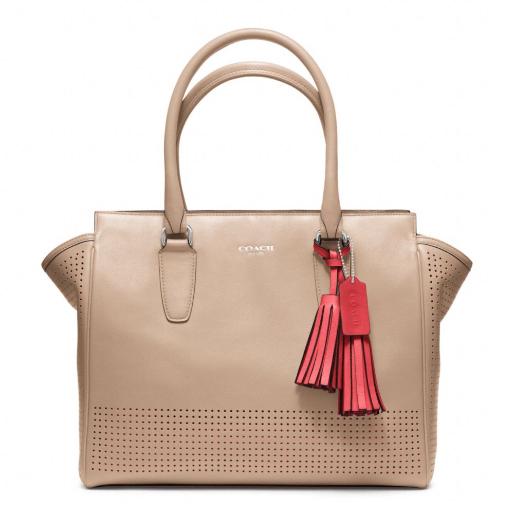 Details| | | Perforated leather Inside zip, cell phone and multifunction pockets Zip-top closure, fabric lining Handles with 7 drop 13 1/4 (L) x 10 3/4 (H) x 5 (W)