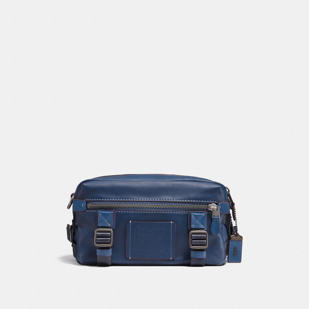 Washed sport calf leather| Inside multifunction pockets| Inside tech sleeve for an iPad Mini| Zip-top closure, fabric lining| Outside zip and snap pockets| Adjustable strap with 26 3/4" length| 11" (L) x 6 3/4" (H) x 5" (W)