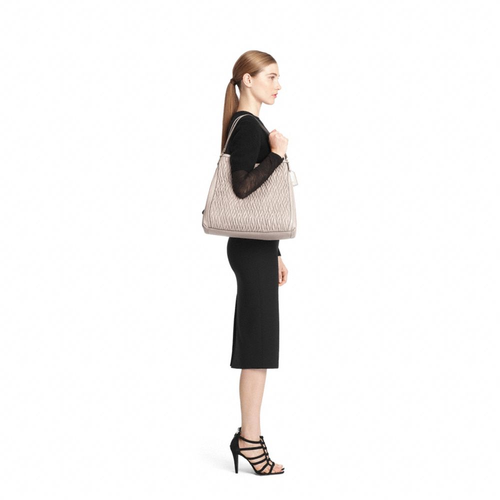 Details| | | Leather| Inside zip, cell phone and multifunction pockets| Center zip compartment| Magnetic snap closures, fabric lining| Handles with 11" drop| 15 1/4" (L) x 13 1/2" (H) x 6 3/4" (W)